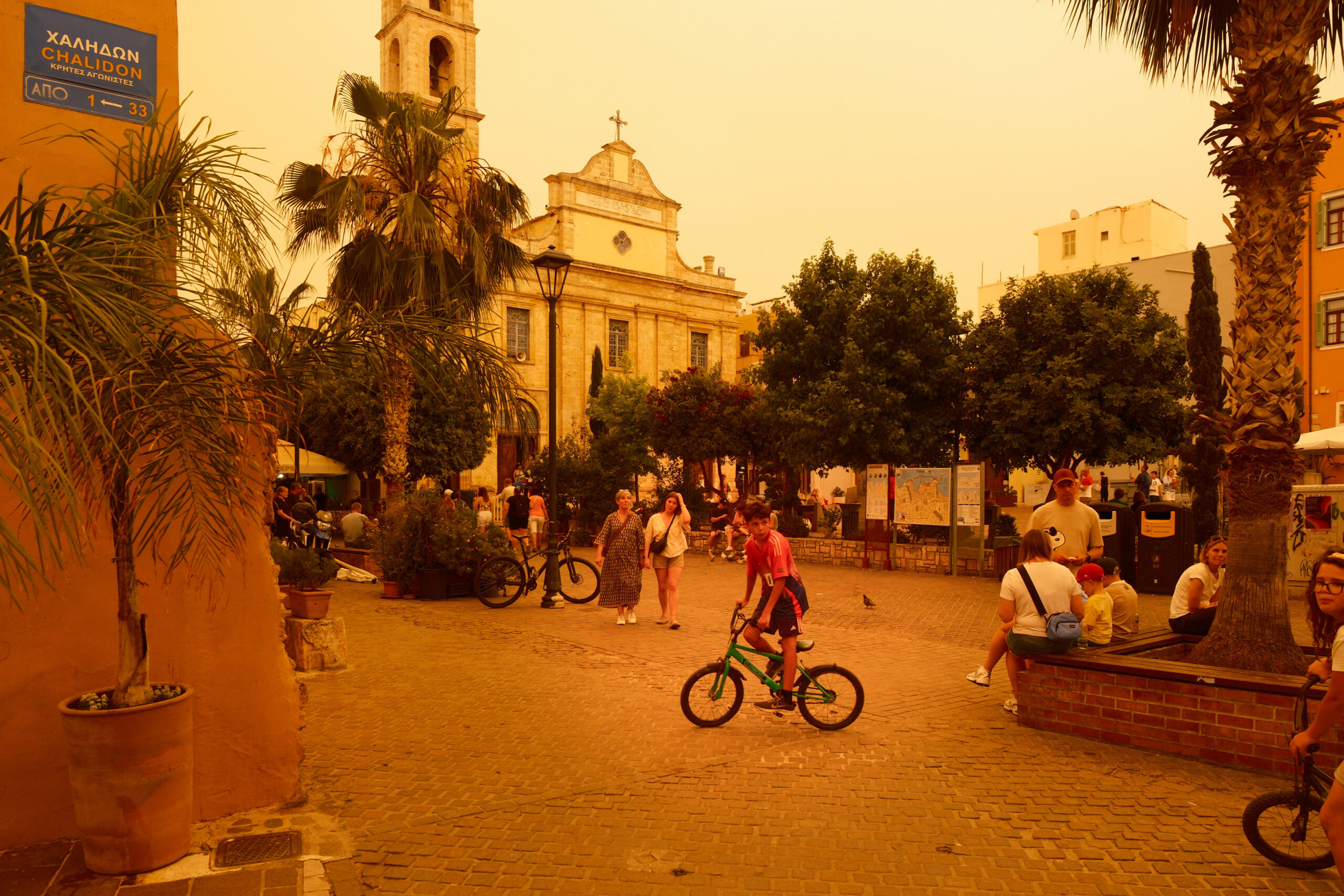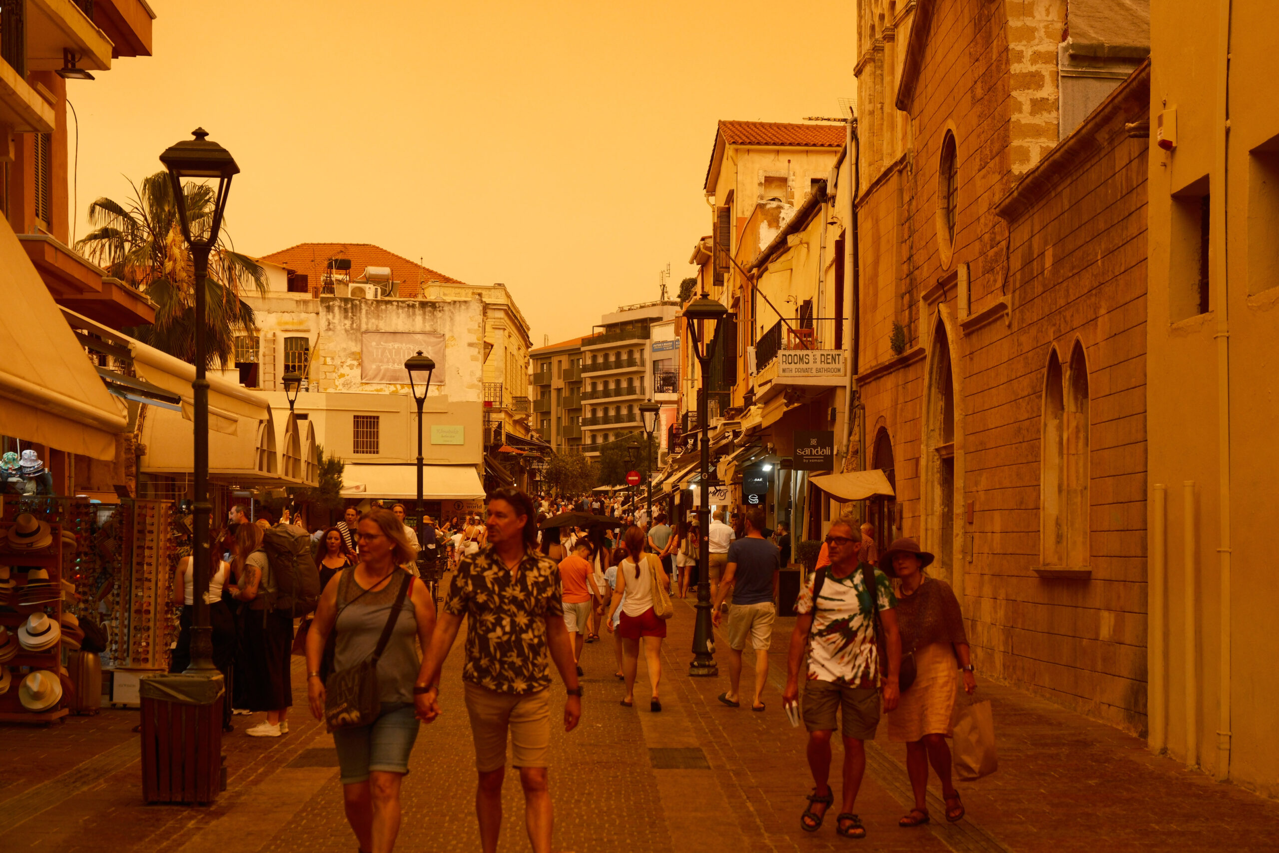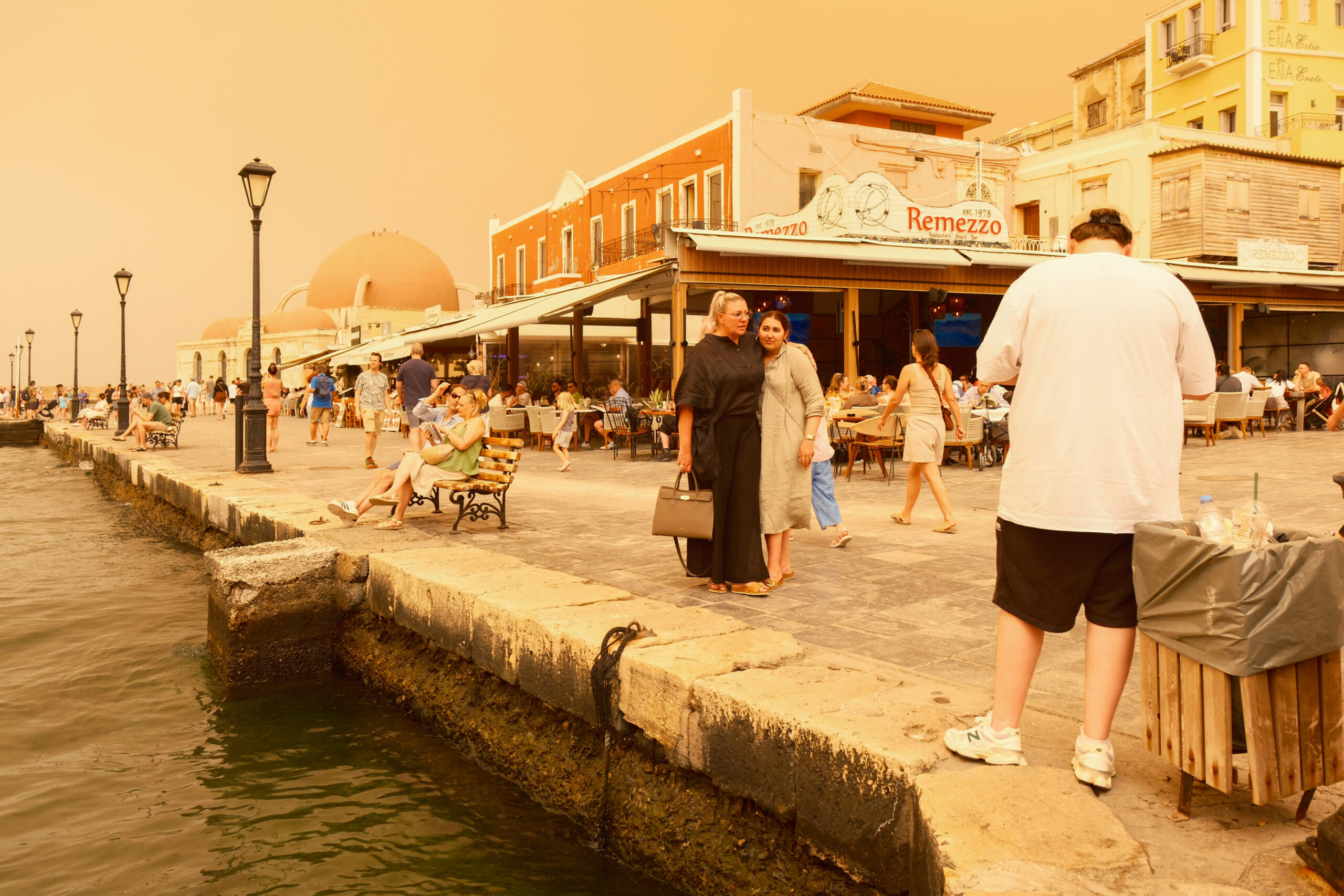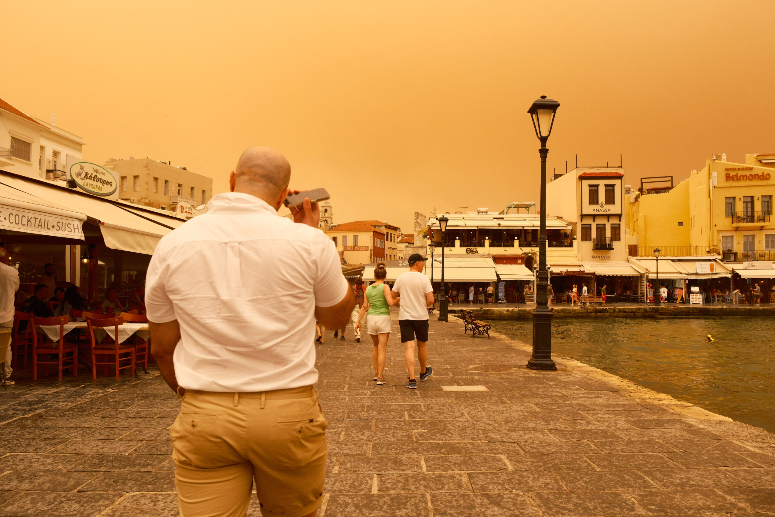 Το μεσημέρι, το φαινόμενο επανήλθε δριμύτερο, με χαρακτηριστικές εικόνες από το Παλιό Λιμάνι των Χανίων να αναδεικνύουν μια απόκοσμη ατμόσφαιρα, όπου ο θολός, πορτοκαλί ουρανός καλύπτει την πόλη, ενώ τουρίστες συνεχίζουν τους περιπάτους τους κάτω από τη βαριά σκιά της σκόνης.