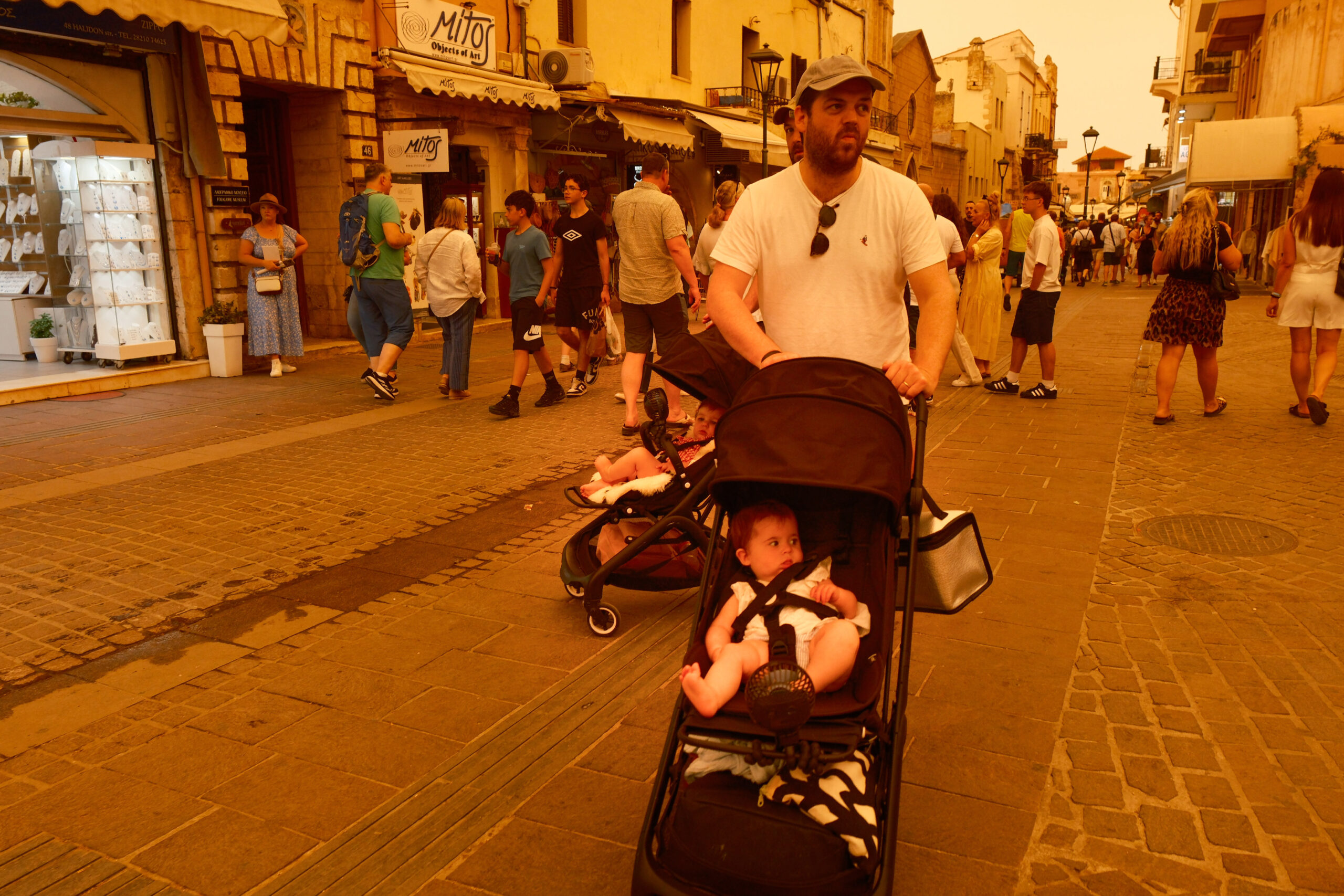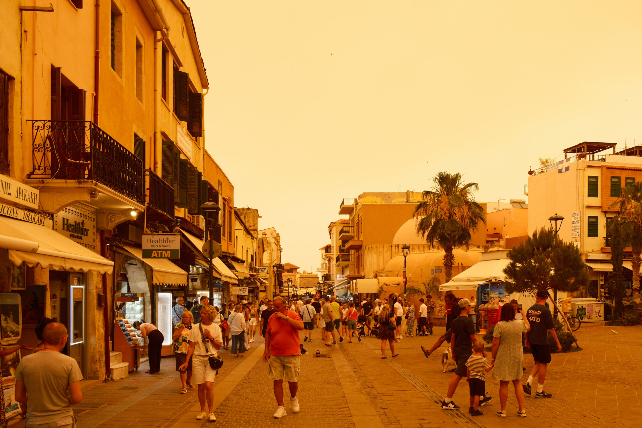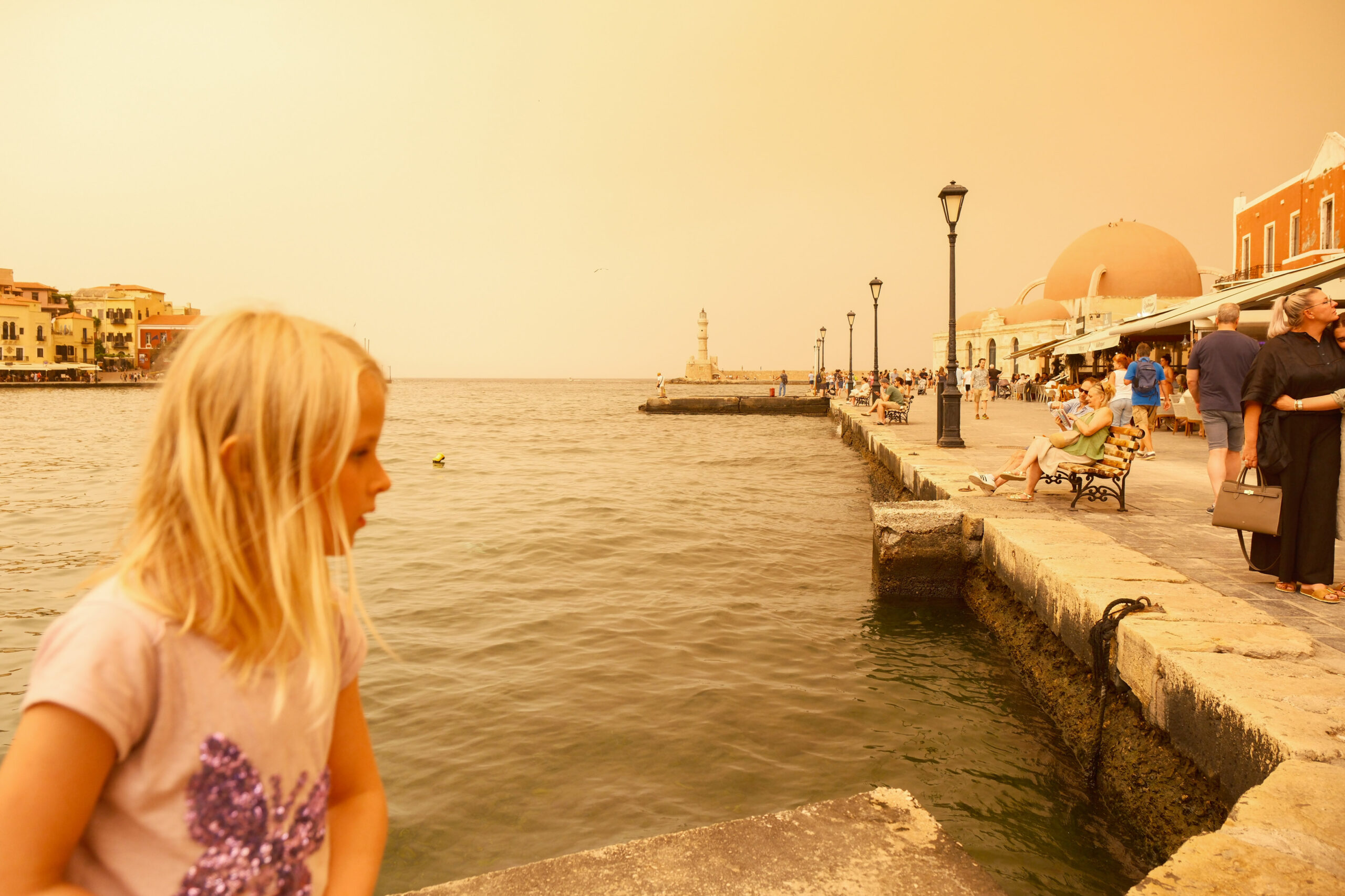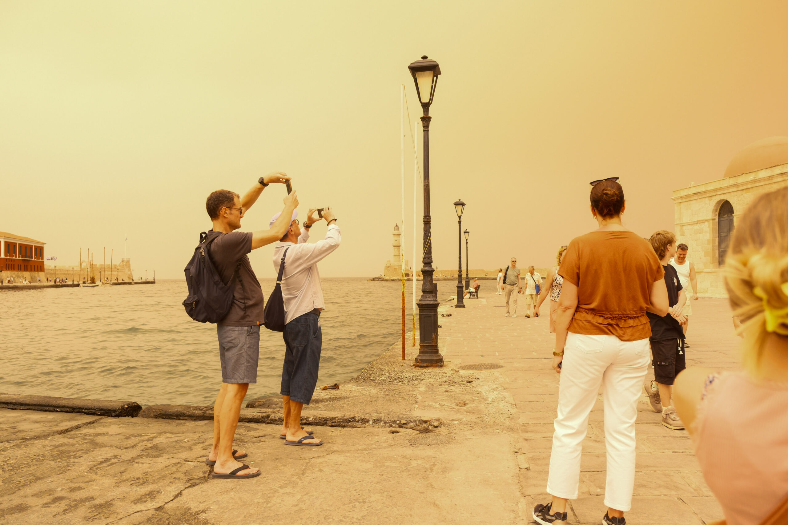Το μεσημέρι, το φαινόμενο επανήλθε δριμύτερο, με χαρακτηριστικές εικόνες από το Παλιό Λιμάνι των Χανίων να αναδεικνύουν μια απόκοσμη ατμόσφαιρα, όπου ο θολός, πορτοκαλί ουρανός καλύπτει την πόλη, ενώ τουρίστες συνεχίζουν τους περιπάτους τους κάτω από τη βαριά σκιά της σκόνης.