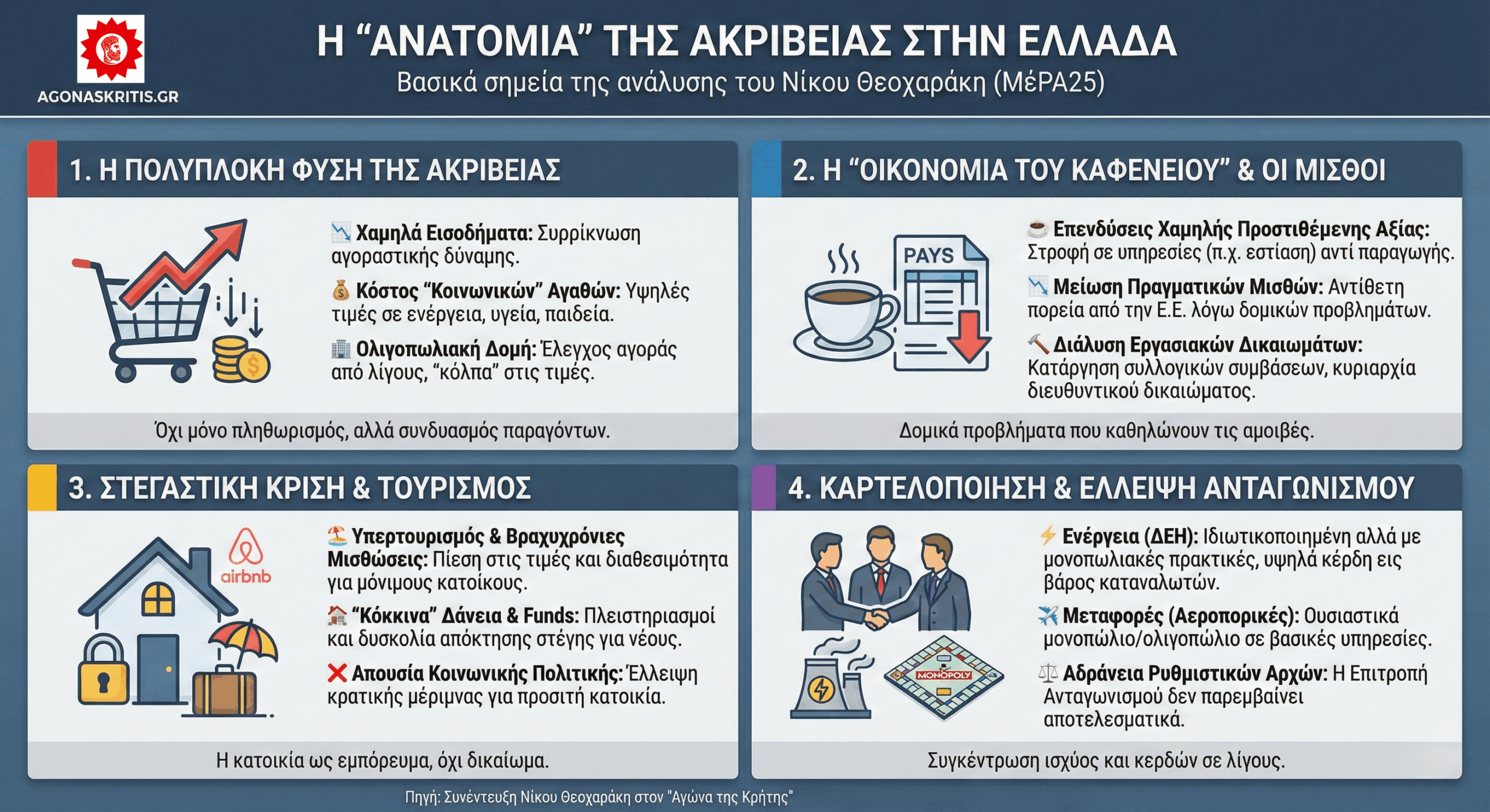 Κλείνοντας αυτή την ενότητα της συζήτησης, ο κ. Θεοχαράκης θέλησε να αποδομήσει την απλουστευτική προσέγγιση γύρω από τον πληθωρισμό. Για το ΜέΡΑ25, η ακρίβεια δεν είναι ένα μονοδιάστατο φαινόμενο, αλλά το αποτέλεσμα μιας συγκεκριμένης πολιτικής που εδράζεται σε τρεις πυλώνες: