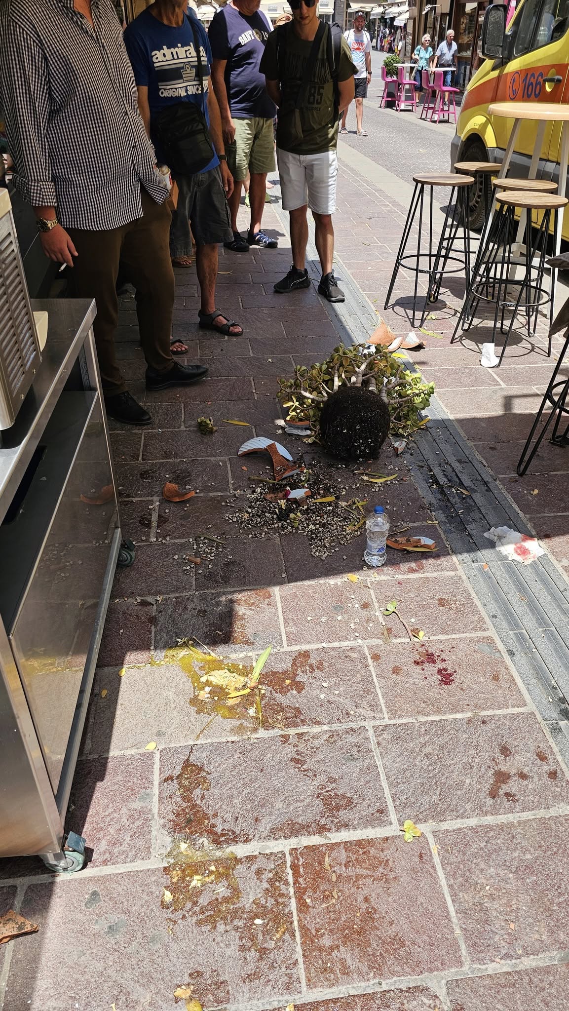 Οι φωτογραφίες από το σημείο καταγράφουν τη σκηνή του ατυχήματος, με τη σπασμένη γλάστρα, το χυμένο χώμα, ίχνη αίματος στο πεζοδρόμιο και την επέμβαση των διασωστών, ενώ η τουρίστρια φαίνεται να φέρει τραύμα στο κεφάλι.