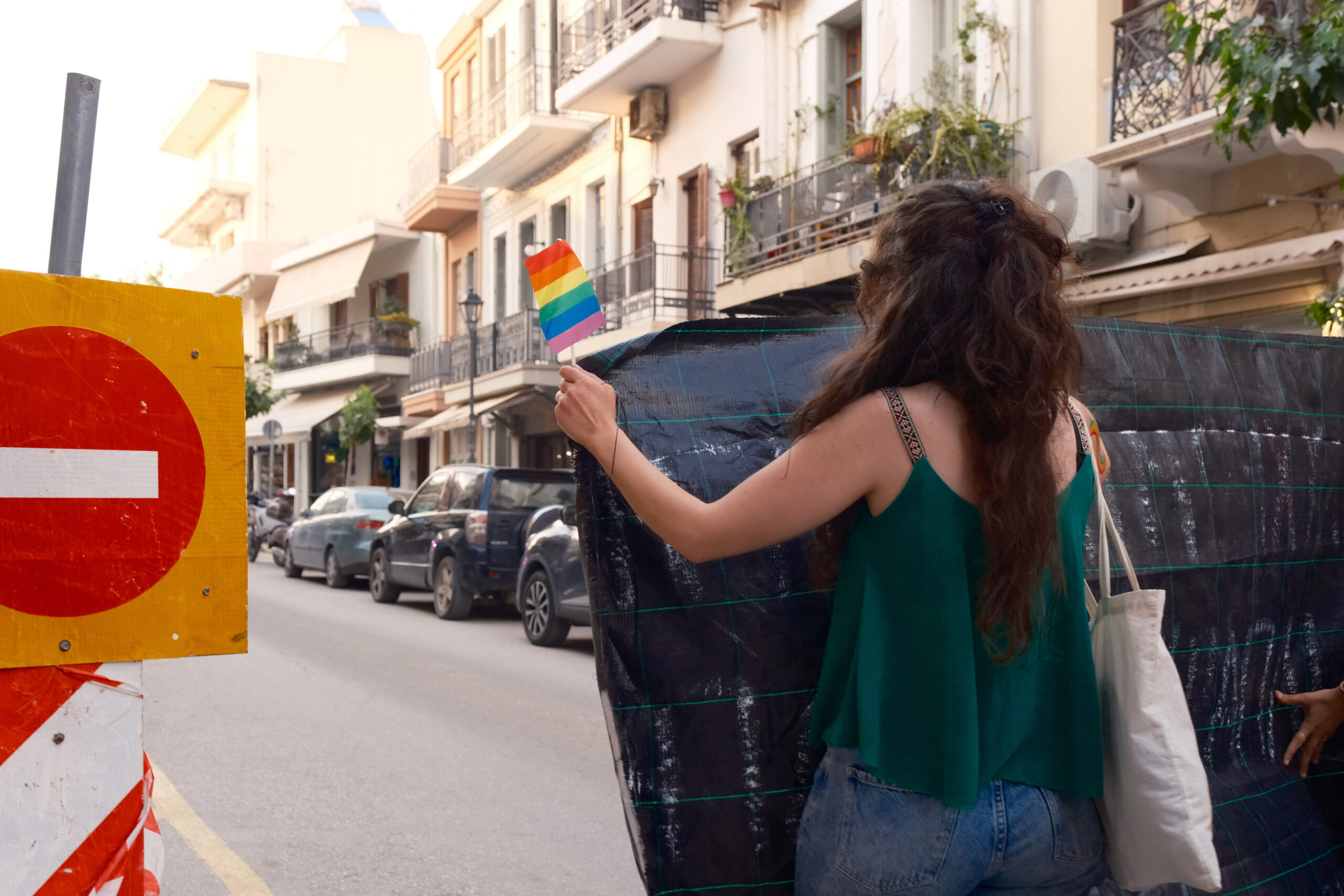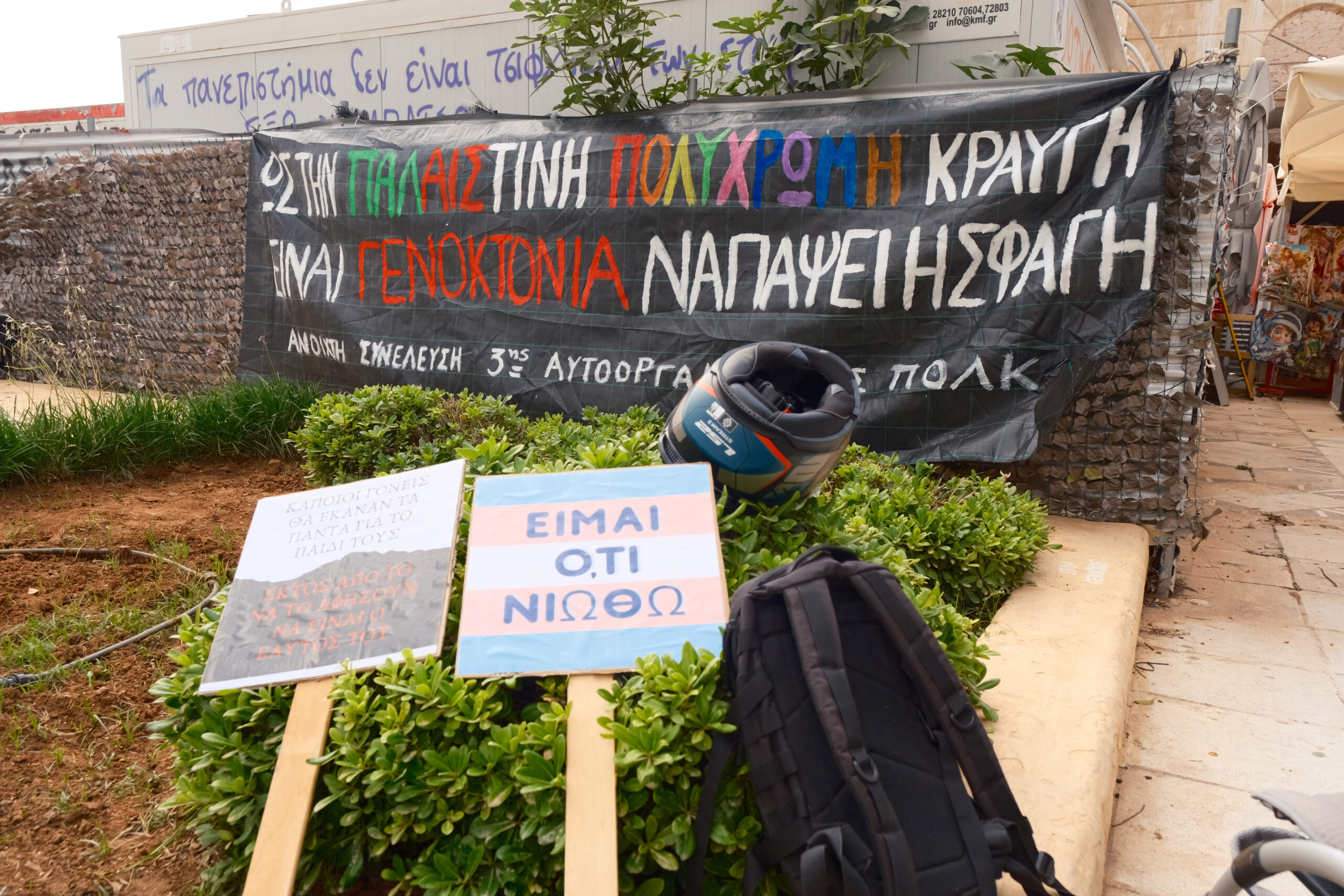 Το πανό σήκωσε ομάδα αλληλέγγυων, συνδέοντας τον αγώνα για τα ΛΟΑΤΚΙΑ+ δικαιώματα με τη διεθνιστική αντίσταση απέναντι στην καταπίεση και τη βία.