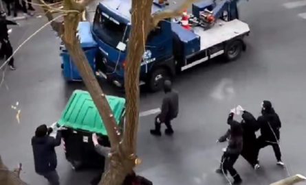 Πάντως, σε λήψη βίντεο από άλλη γωνία, αν και φαίνεται ότι κάνει επικίνδυνους ελιγμούς και τρέχει πολύ γρήγορα σε περιοχή όπου υπάρχουν διαδηλωτές, φαίνεται επίσης ότι οι διαδηλωτές σπρώχνουν τους κάδους πάνω στον γερανό, ένας εκ των οποίων κτύπησε μετά διαδηλωτή.
