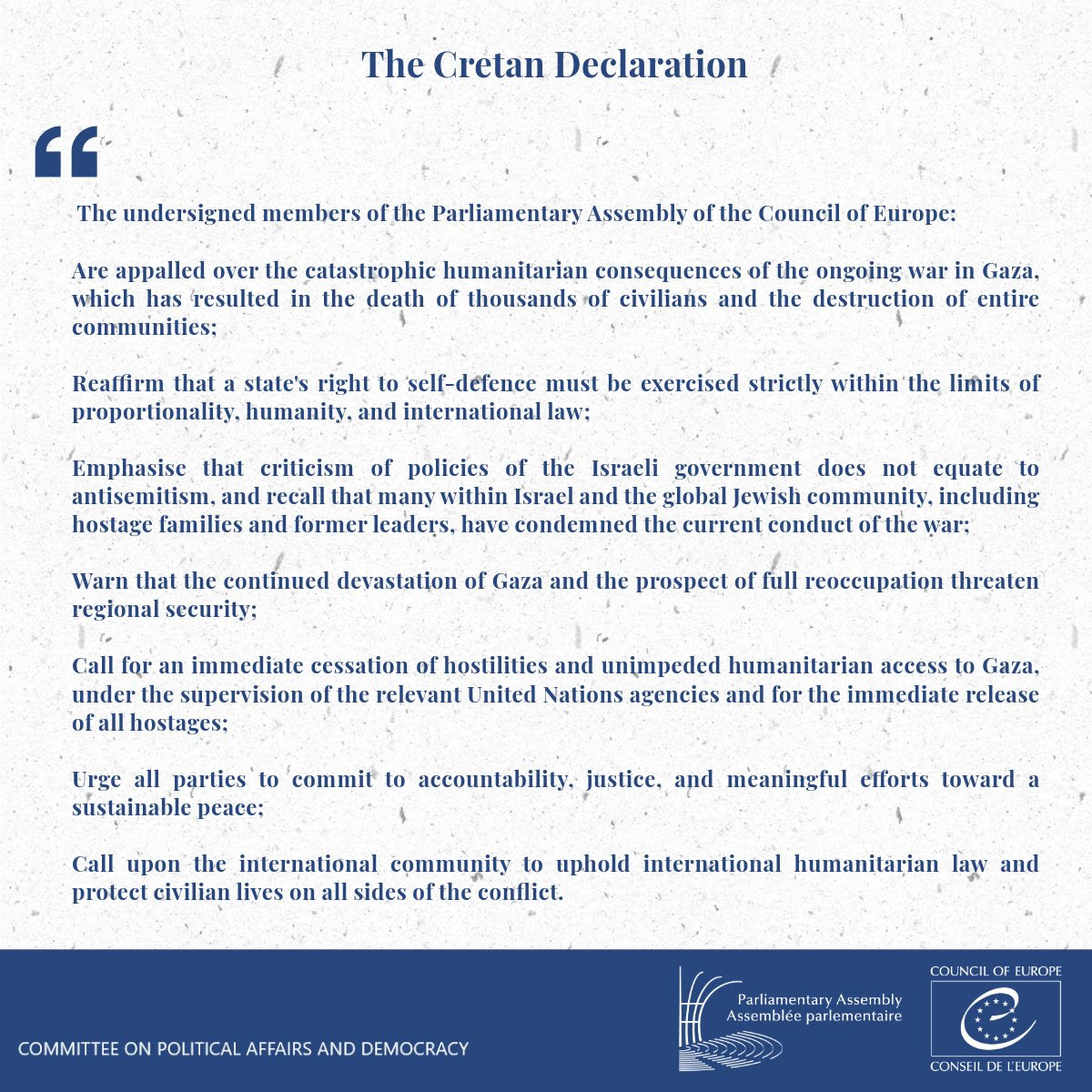 Η Διακήρυξη της Κρήτης, η οποία φέρει τη σφραγίδα του Συμβουλίου της Ευρώπης και της Επιτροπής Πολιτικών Υποθέσεων και Δημοκρατίας, αποτελεί ένα σημαντικό κείμενο με διεθνή απήχηση, που τοποθετείται με σαφήνεια υπέρ της ειρήνης, της νομιμότητας και της ανθρωπιάς σε μια από τις πιο αμφιλεγόμενες και αιματηρές συγκρούσεις της εποχής μας.