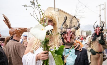 Οι μεταμφιεσμένοι έχουν κρεμασμένα επάνω τους κουδούνια προβάτων και προβιές ζώων.