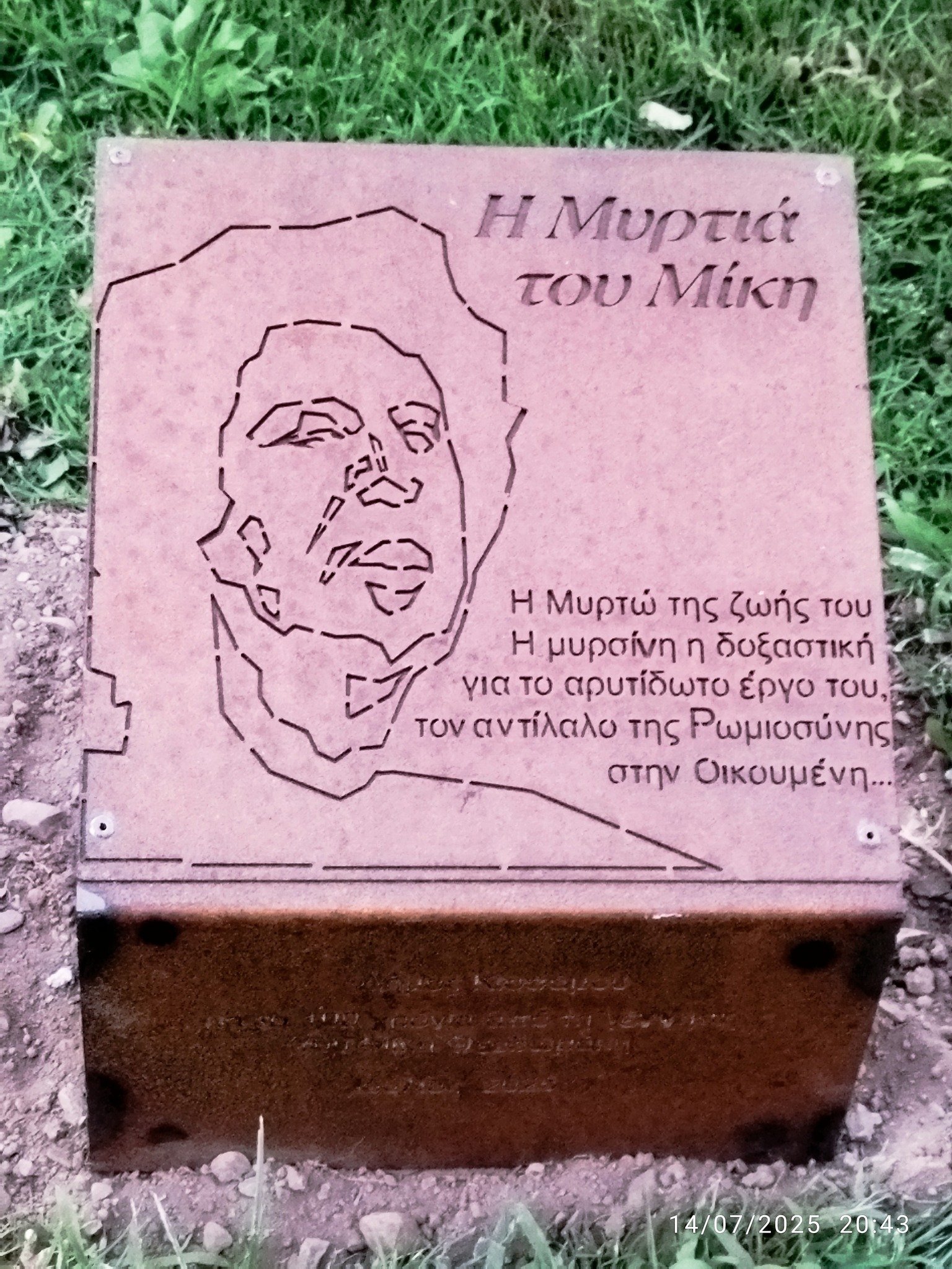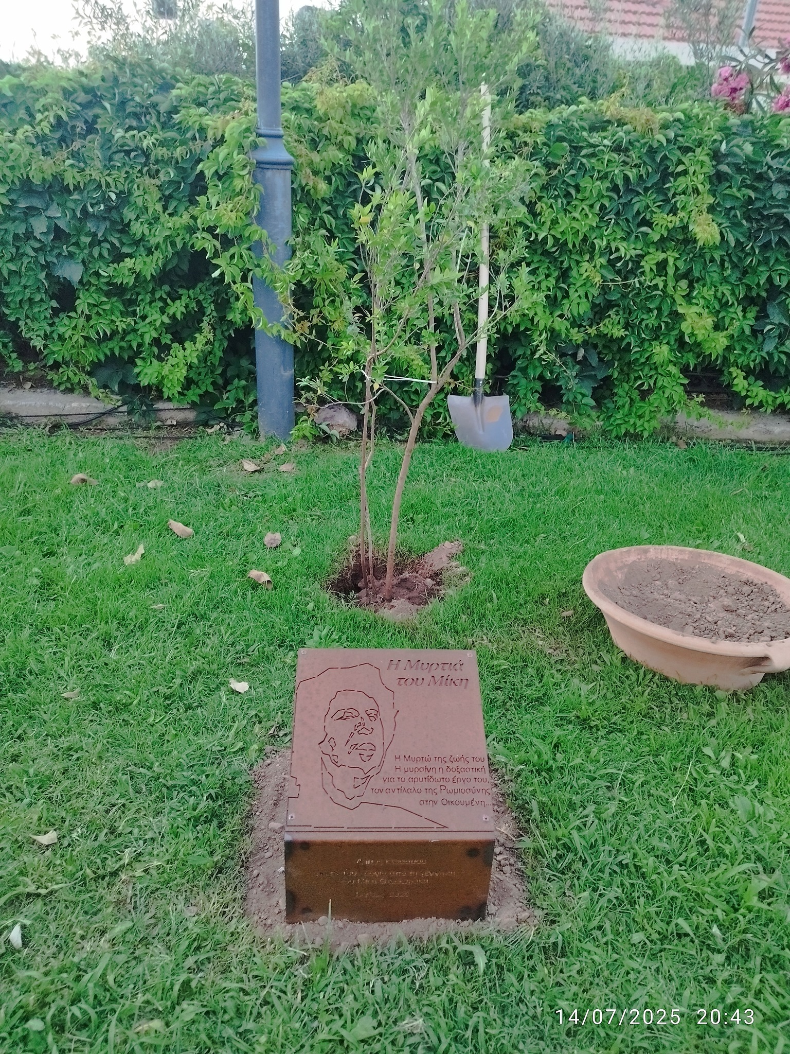 Στο σημείο όπου φυτεύτηκε η μυρτιά, τοποθετήθηκε αναμνηστική πλάκα με την εξής αφιέρωση: