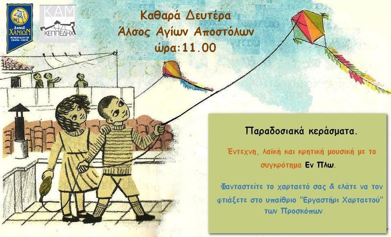 Κούλουμα στο άλσος των Αγίων Αποστόλων με το μουσικό σχήμα “Εν Πλω”, παραδοσιακά κεράσματα, αναβίωση παραδοσιακών παιχνιδιών & κατασκευή χαρταετών από τους Προσκόπους Χανίων.