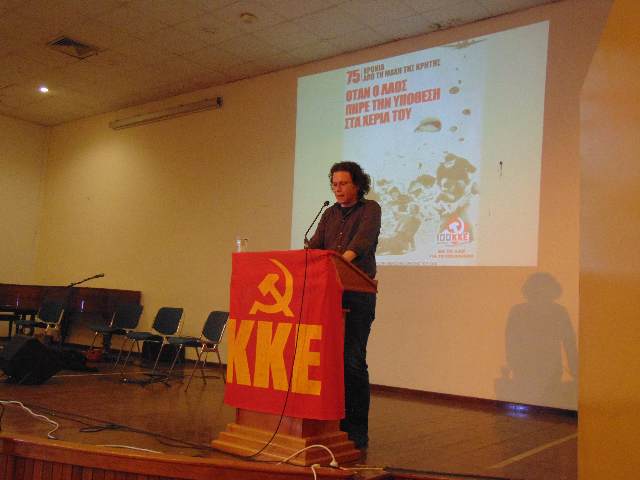 Στην εκδήλωση μίλησαν οι Γιώργος Μαργαρίτης, καθηγητής Σύγχρονης Ιστορίας στο ΑΠΘ, με θέμα «Ο λαός της Κρήτης στη μάχη κατά του ναζισμού» και Αντρέας Κοκοσάλης, μέλος του ΓΠ Κρήτης του ΚΚΕ, με θέμα «Η συμβολή των κομμουνιστών στη Μάχη της Κρήτης. Πείρα και διδάγματα».