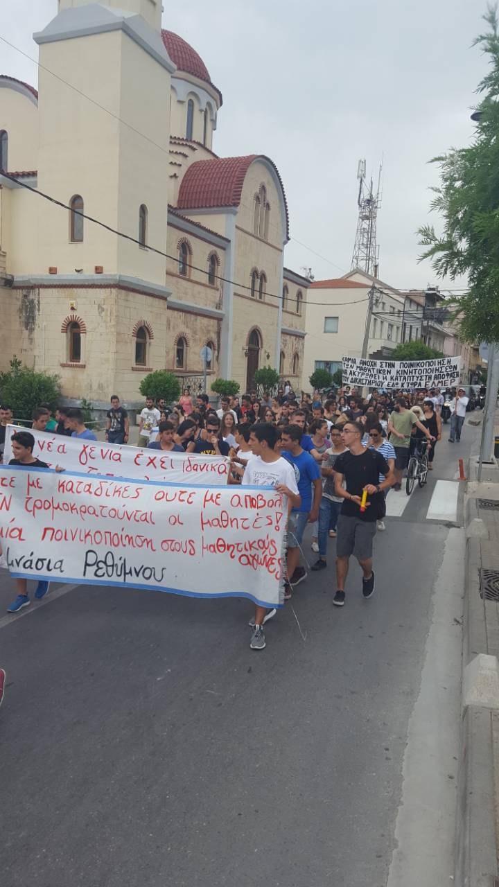 Συλλαλητήριο ενάντια στην ποινικοποίηση των μαθητικών κινητοποιήσεων και με αίτημα την ανάκληση της καταδικαστικής απόφασης κατά των τριών μαθητών στους οποίους επιβλήθηκε κοινωνική εργασία ογδόντα ωρών για τη συμμετοχή τους στις καταλήψεις του περασμένου Σεπτεμβρίου, πραγματοποίησαν σήμερα εκατοντάδες μαθητές και εκπαιδευτικοί στο Ρέθυμνο.