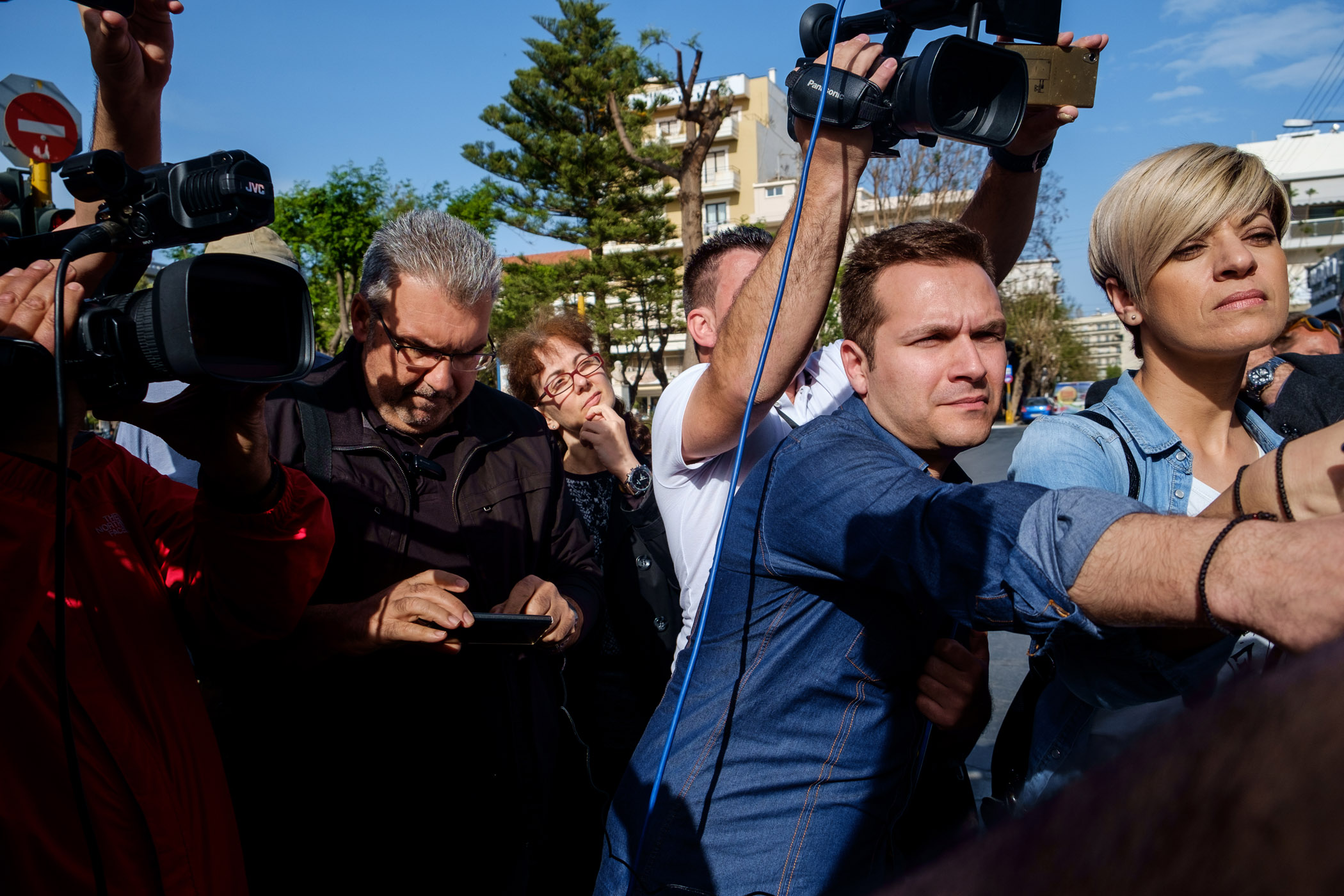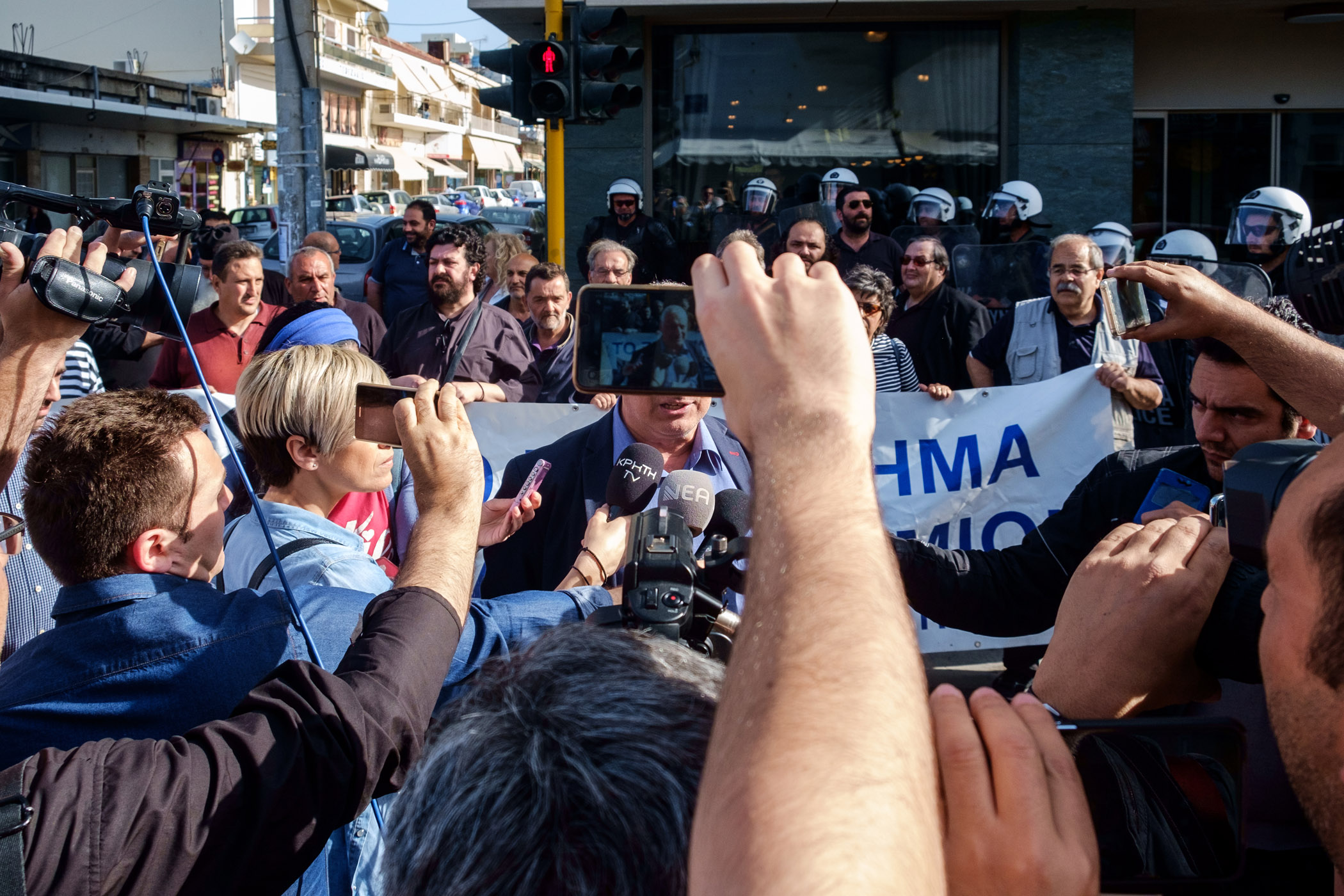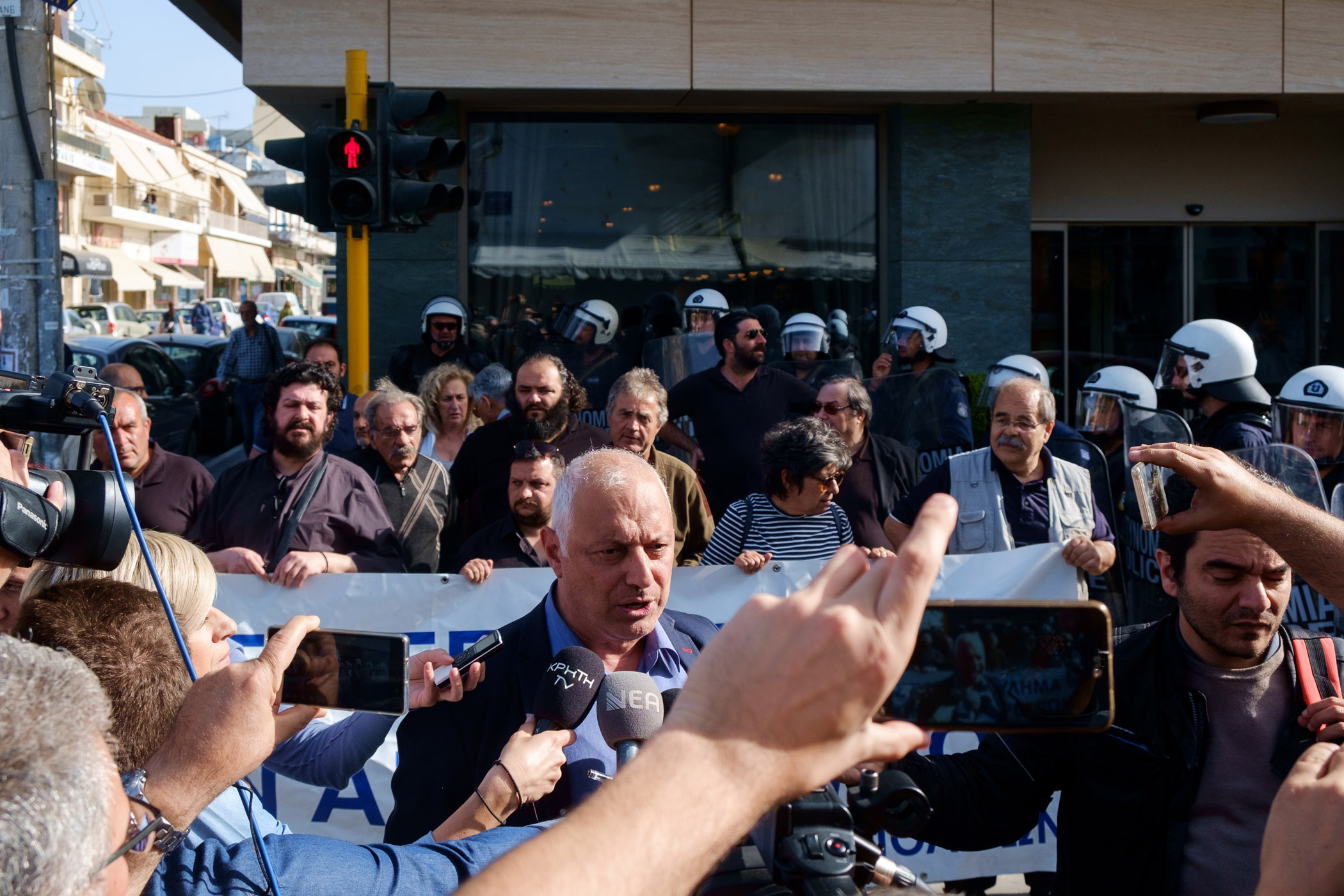 Στο σημείο υπήρχαν ισχυρότατες αστυνομικές δυνάμεις με κλούβα των ΜΑΤ και ειδικές δυνάμεις να φράζουν τον δρόμο στους διαδηλωτές που ήθελαν να εισέλθουν στο κτίριο.