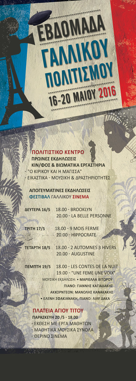Με την στήριξη της Περιφέρειας Κρήτης, του Europe-Direct-Περιφέρειας Κρήτης, του δήμου Ηρακλείου, και του Γαλλικού Ινστιτούτου Ελλάδας θα πραγματοποιηθεί η «Εβδομάδα Γαλλικού Πολιτισμού» από 16 έως 20 Μαΐου 2016 στο Πολιτιστικό Κέντρο του δήμου Ηρακλείου με κινηματογραφικό αφιέρωμα στο Γάλλο δημιουργό Michel Ocelot που προετοίμασε η Ένωση Καθηγητών Γαλλικής Φιλολογίας Κρήτης.