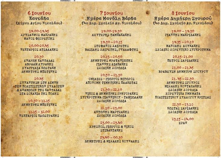 Σύμφωνα με τους οργανωτές 35 περίπου συγκροτήματα θα συμμετέχουν στο τετραήμερο φεστιβάλ και την πρώτη βραδιά θα πραγματοποιηθεί καντάδα με τη συμμετοχή όλων των πολιτιστικών συλλόγων της περιοχής. Η δεύτερη βραδιά θα είναι αφιερωμένη στο δάσκαλο (Δ/ντή του 1ου Δημ. Σχ. Αγίου Νικολάου) Δημήτρη Σγουρό μεγάλο καλλιτέχνη της Κρητικής μουσικής. Η τρίτη βραδιά θα είναι αφιερωμένη στον αείμνηστο Μανόλη Βάρδα δάσκαλο και μεγάλο μαντιναδολόγο. Την τέταρτη βραδιά θα γίνει γλέντι με τη συμμετοχή συγκροτημάτων (Aντώνης Μαρτσάκης, Μανόλης Αλεξάκης, Ζαχάρης Μελεσσανάκης, Ψαρογιώργης, Ψαραντώνης, Ηλίας Χορευτάκης, Δημήτρης Μπετίνης, Μιχάλης Σπυριδάκης, Κωστής Σαριδάκης ,Daulutte κ.α.).