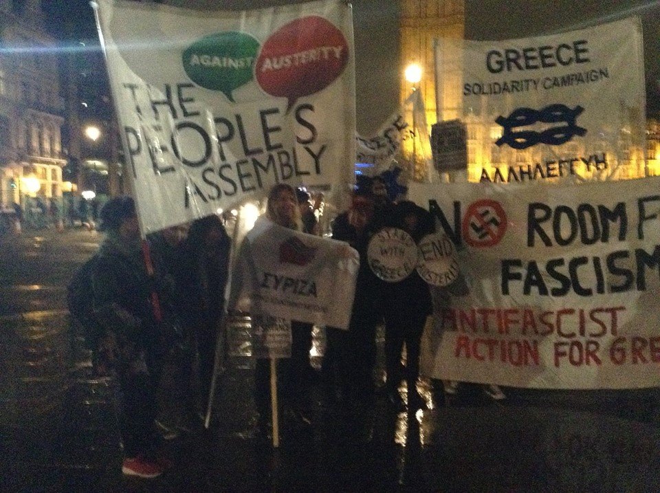 Αν και οι καιρικές συνθήκες ήταν κακές και το κάλεσμα έγινε την τελευταία στιγμή, τελικώς νέα συγκέντρωση αλληλεγγύης προς την Ελλάδα πραγματοποιήθηκε στο Λονδίνο, την Πέμπτη στις 18:30 απέναντι από τη Βρετανική βουλή στο άγαλμα του Churchill.