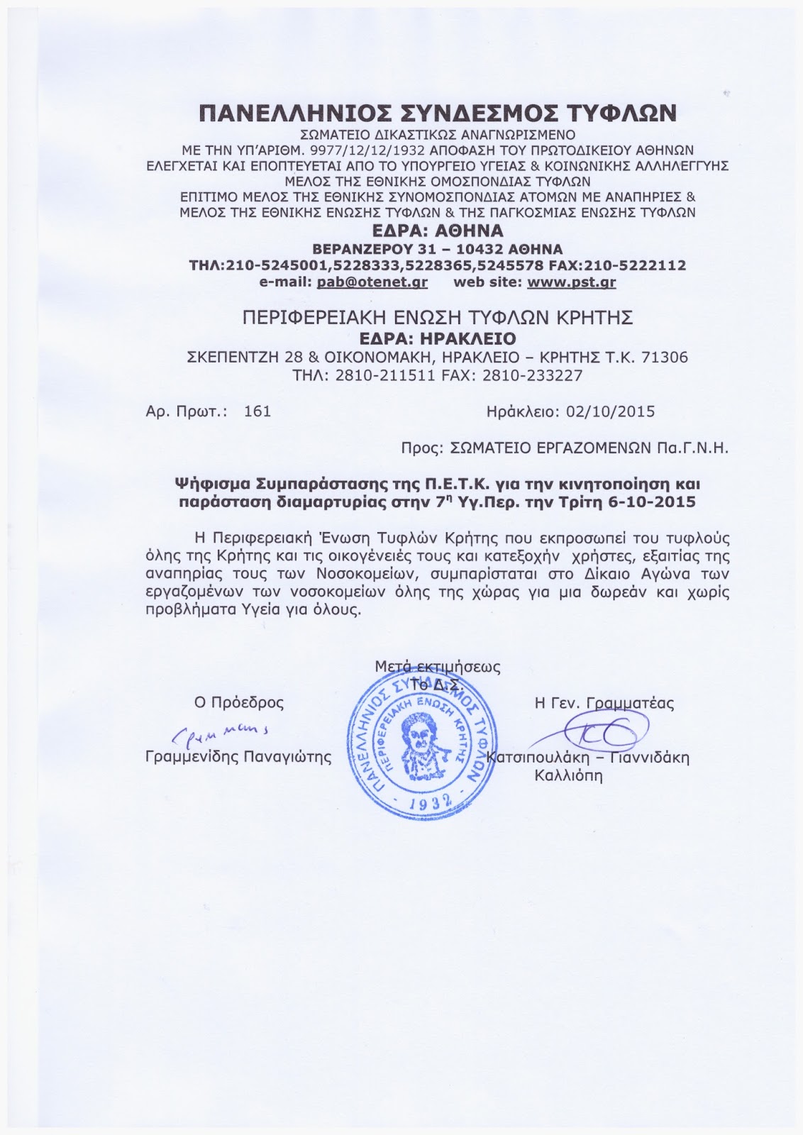 o   Να προχωρήσουμε σε παγκρήτια κινητοποίηση και παράσταση διαμαρτυρίας στην 7ηΥγειονομική Περιφέρεια την Τρίτη 6 Οκτώβρη στις 11:00 π.μ.