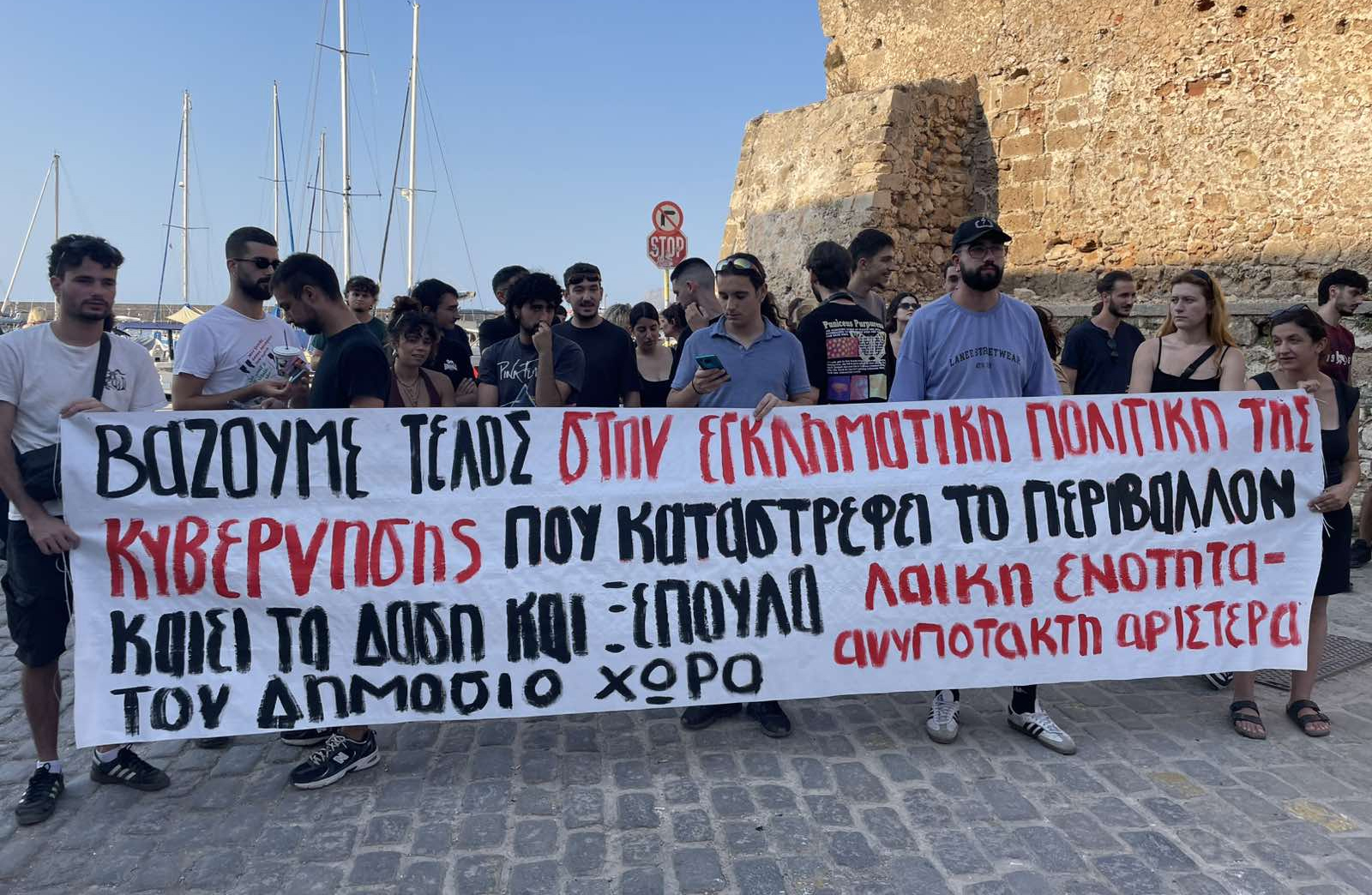 Οι συμμετέχοντες στην κινητοποίηση σήκωσαν πανό και φώναξαν συνθήματα, εκφράζοντας την έντονη αντίθεσή τους στη μετατροπή της Κρήτης σε “ενεργειακή αποικία” με εξορύξεις, ανεμογεννήτριες και πυλώνες υψηλής τάσης που “σχεδιάζονται και υλοποιούνται χωρίς διαβούλευση με τις τοπικές κοινωνίες”.