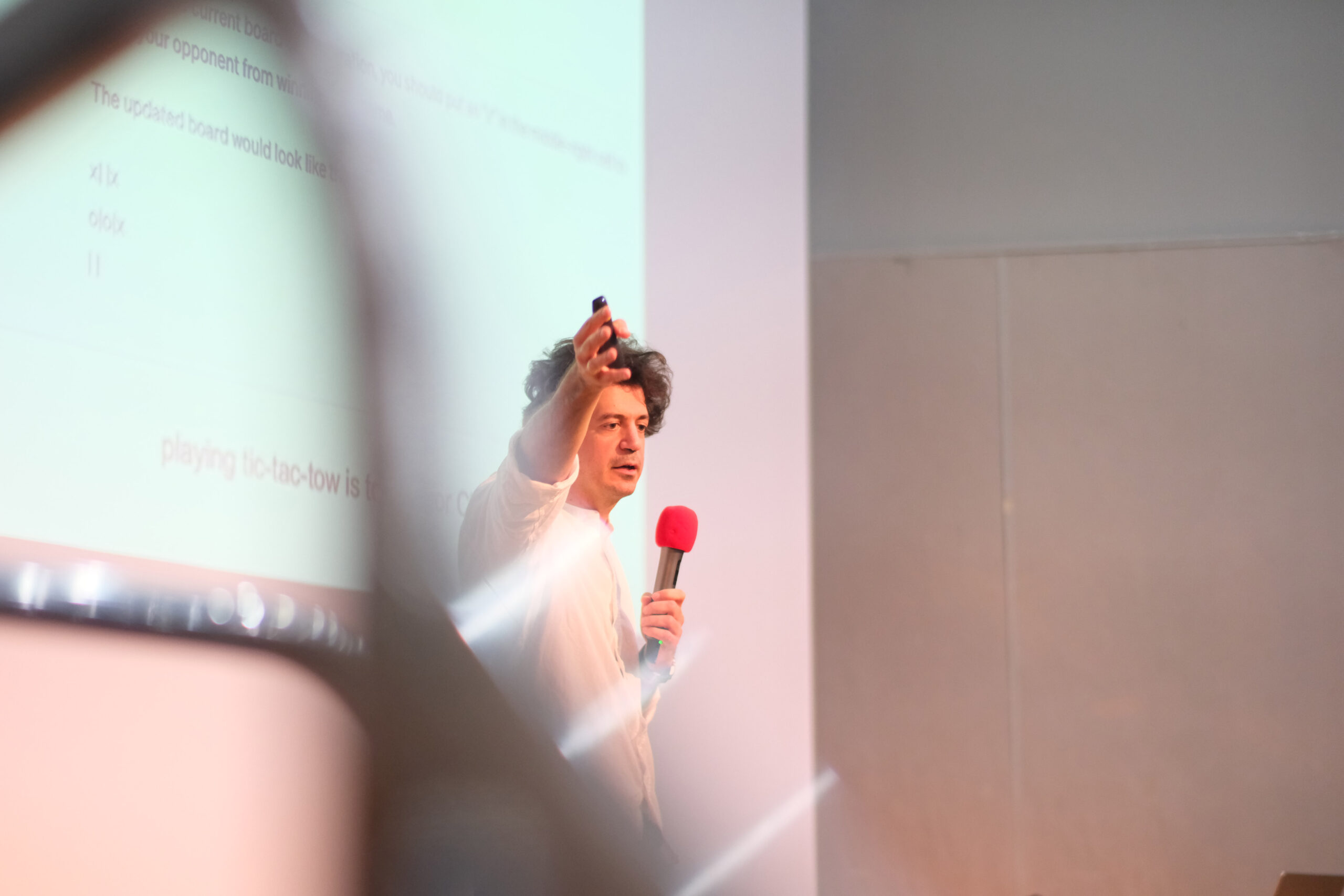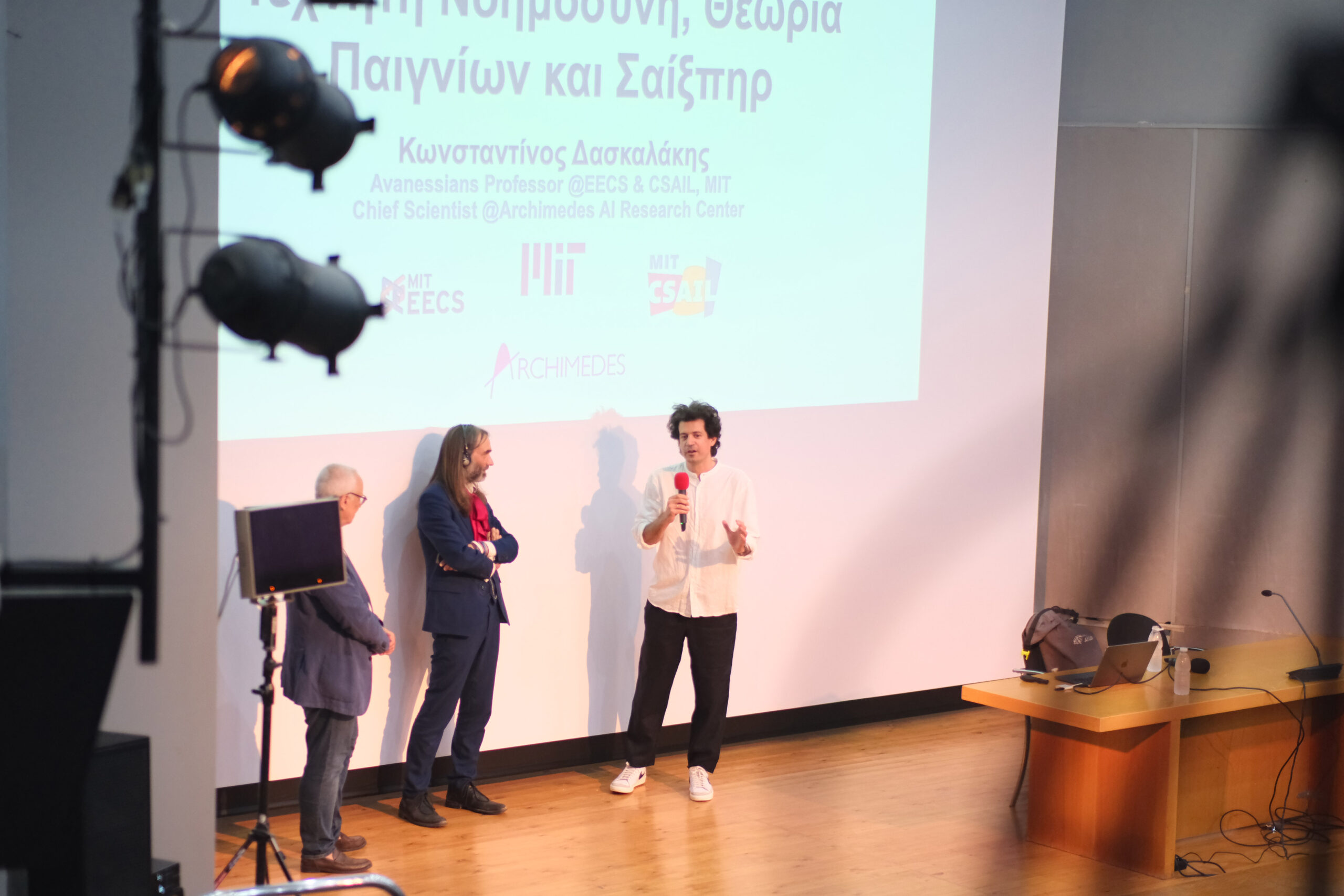 Εστίασε ιδιαίτερα στη Θεωρία Παιγνίων, το επιστημονικό πεδίο όπου έχει διαπρέψει παγκοσμίως, και εξήγησε με απλό και κατανοητό τρόπο πώς οι μαθηματικοί κανόνες που διέπουν τα στρατηγικά παιχνίδια και τις αλληλεπιδράσεις μεταξύ “παικτών” μπορούν να εφαρμοστούν στην τεχνητή νοημοσύνη για την επίλυση προβλημάτων, τη λήψη αποφάσεων, αλλά ακόμη και για την ανάλυση αφηγηματικών δομών.