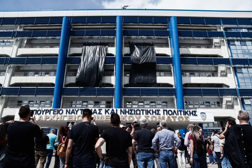 Μαύρα πανιά κρέμασαν οι απεργοί της Ζώνης στο υπουργείο Ναυτιλίας, υπουργείο του εγκλήματος και της εργοδοσίας, όπως το χαρακτηρίζουν καταγγέλλοντας το προδιαγεγραμμένο εργοδοτικό έγκλημα.