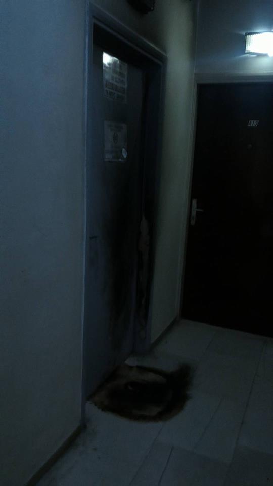 Οι άγνωστοι, αφού εισέβαλλαν στην πολυκατοικία, προσπάθησαν να βάλουν φωτιά στην είσοδο των γραφείων της Χρυσής Αυγής προκαλώντας ζημιές στην πόρτα.