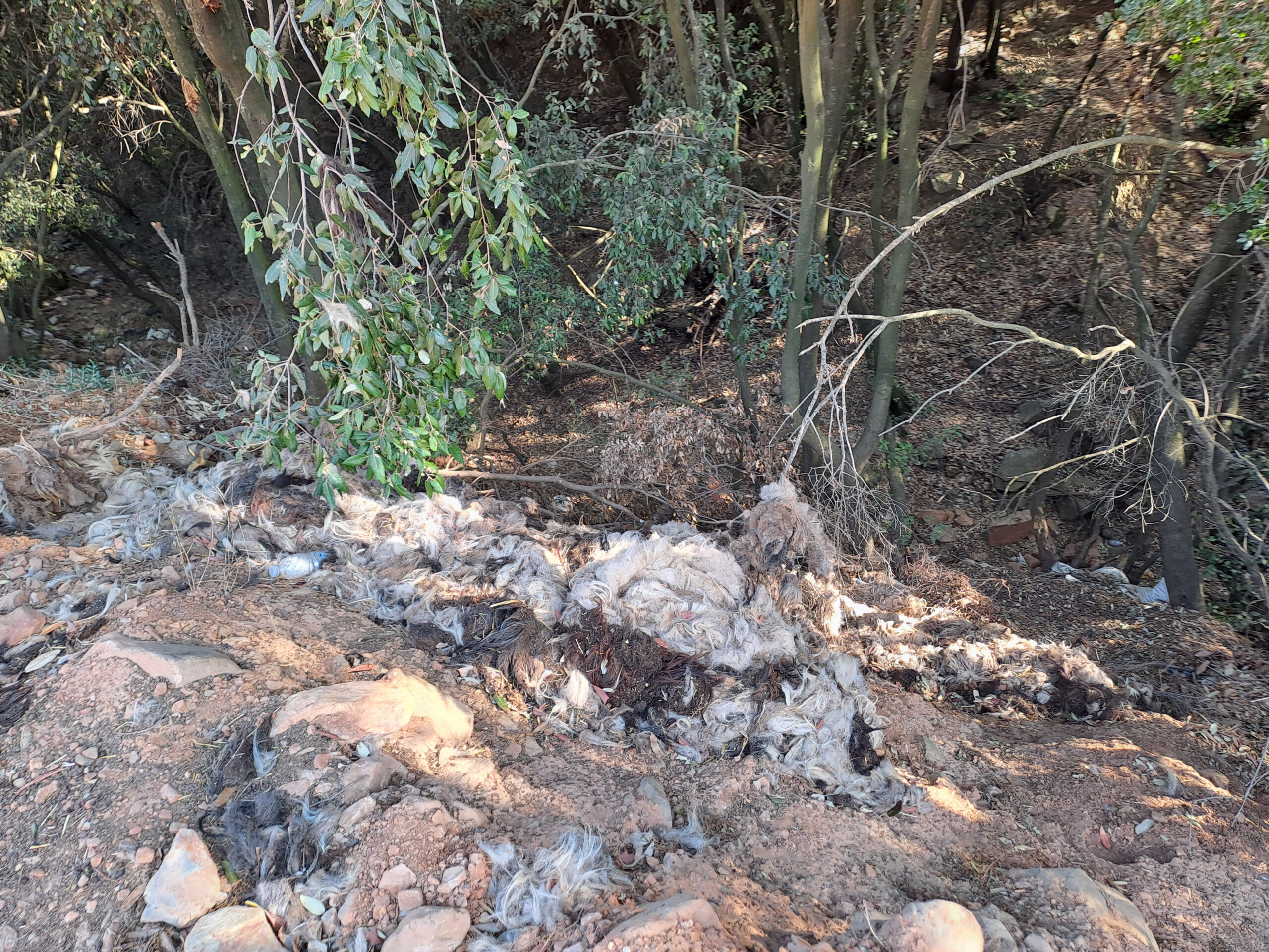 Το σοβαρότερο όμως πρόβλημα, όπως σημειώνεται στην καταγγελία, είναι η συστηματική απόρριψη προβιών, τούφες μαλλιού και ακόμη και νεκρών αιγοπροβάτων, μετατρέποντας το ρέμα σε εστία μόλυνσης του υδροφόρου ορίζοντα αλλά και της ευρύτερης περιοχής. Οι εργάτες που δραστηριοποιούνται στα γύρω χωράφια εκτίθενται σε σοβαρούς υγειονομικούς κινδύνους, ενώ η δυσωδία της αποσύνθεσης είναι έντονη και διάχυτη.