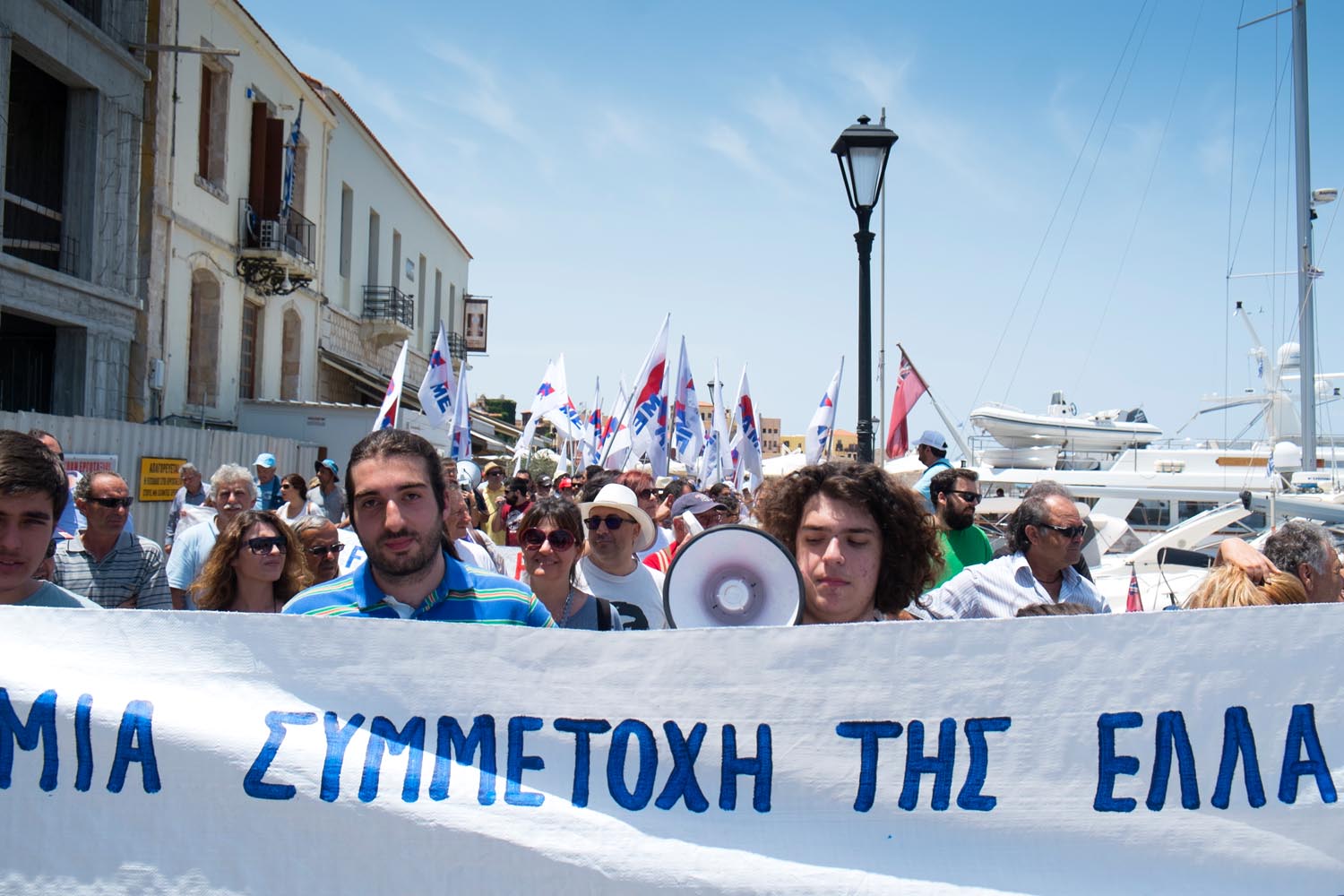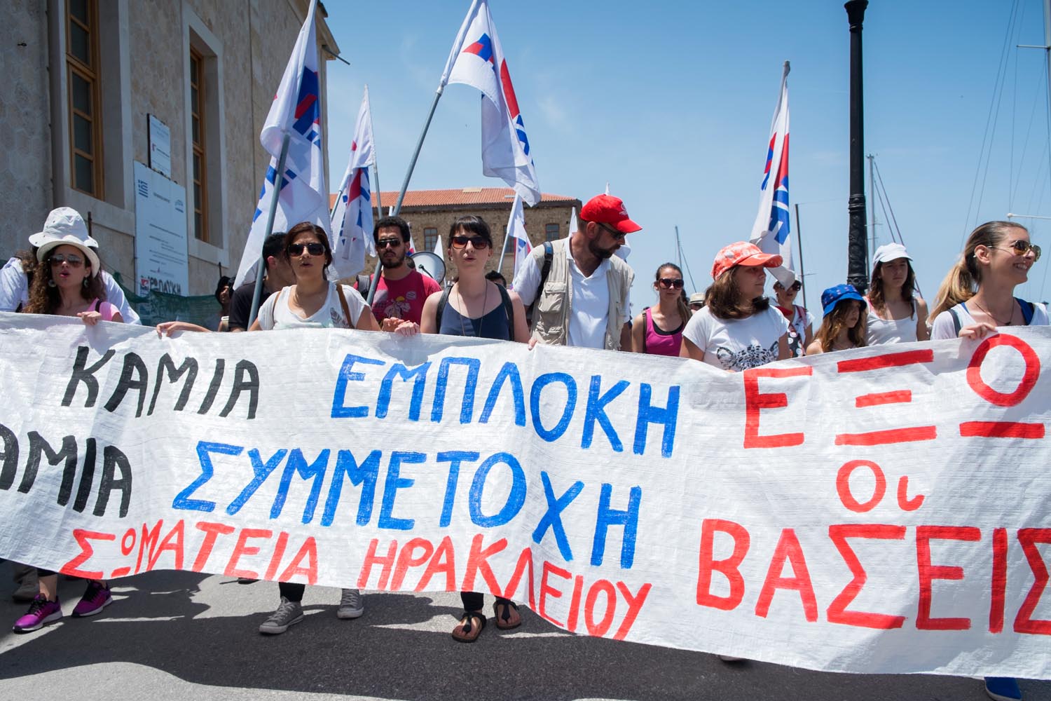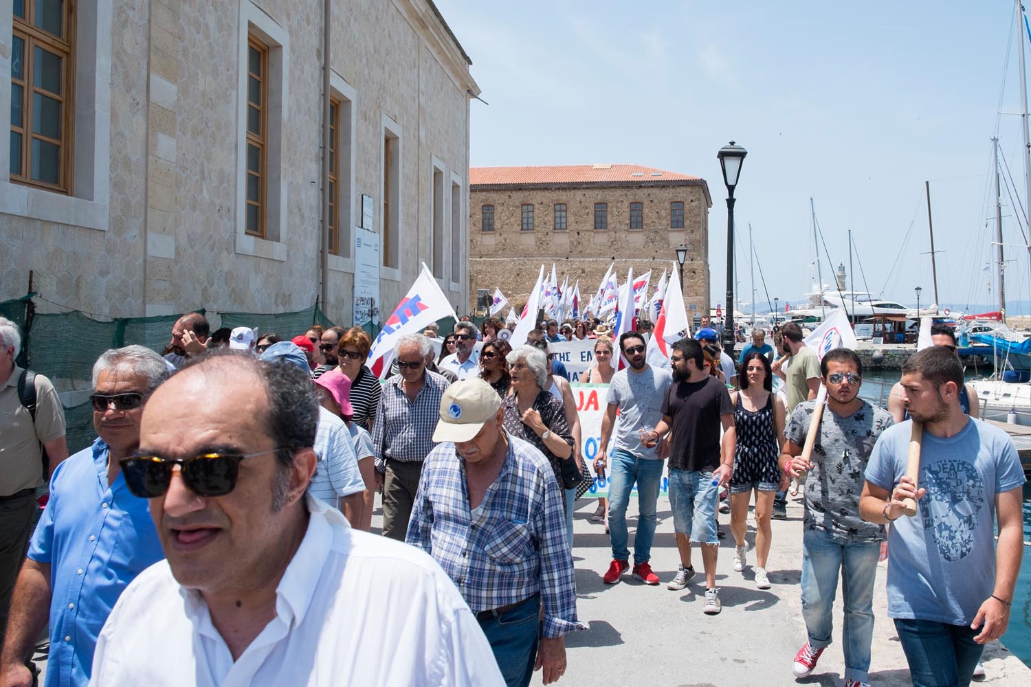 Οι διαδηλωτές που ξεπέρασαν τις αρκετές εκατοντάδες κατέβηκαν από τη Χάληδων και διέσχισαν όλο το λιμάνι φωνάζοντας συνθήματα ενάντια στο καθεστώς των βάσεων στα Χανιά.