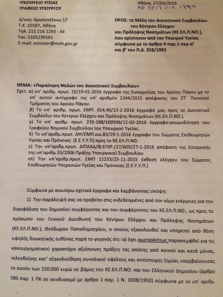 Δείτε εδώ το έγγραφο του Υπουργείου που ζητά την παραίτηση των μελών του Δ.Σ. του ΚΕΕΛΠΝΟ