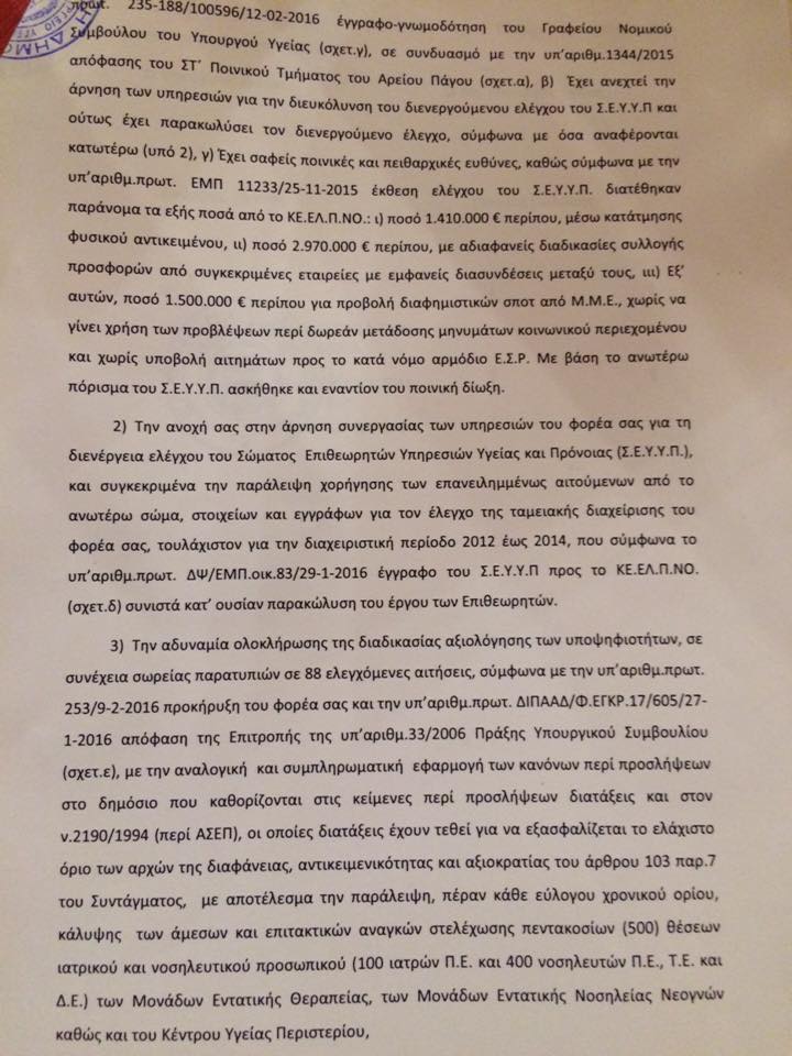 Οι δύο υπουργοί ζητούν την παραίτηση των μελών του Δ.Σ. του ΚΕΕΛΠΝΟ λόγω «της αδυναμίας ολοκλήρωσης της διαδικασίας αξιολόγησης των υποψηφιοτήτων σε συνέχεια σωρείας παρατυπιών σε 88 ελεγχόμενες αιτήσεις….. με αποτέλεσμα την παράλειψη πέραν κάθε εύλογου χρονικού ορίου κάλυψης των άμεσων και επιτακτικών αναγκών στελέχωσης των ΜΕΘ».
