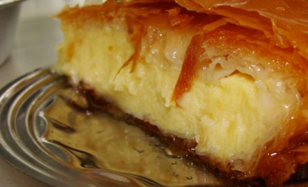 Δεκατρία (13) φύλλα. Βάζομε επτά φύλλα κάτω, καλά βουτυρωμένα. Κρυώνομε την κρέμα, να μην κάνει πέτσα ανακατεύοντας την και την ρίχνομε στα φύλλα. Από πάνω τα υπόλοιπα φύλλα καλά βουτυρωμένα. Θέλει πολύ βούτυρο 350-400 γρ. και καλό αγελαδινό. Όλα τα γλυκά τα σιροπιαστά θέλουν βούτυρο αγελαδινό. Γιατί το πρόβειο βγάζει μαυριλαδάκια στο ψήσιμο. Ψήσιμο 1 έως 1,5 ώρα στους 160 βαθμούς. Κρύο σιρόπι, ζεστό το γλυκό