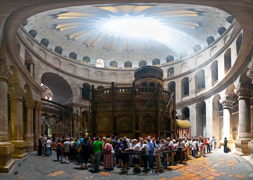 Επιστροφή στην Πόλη, πέρασμα από το ανώγειο του Μυστικού Δείπνου, το νεκροταφείο της Αγιοταφικής Κοινότητας, την Πατριαρχική Σχολή με τους επτά της μαθητές, την Πύλη της Σιών, την Προβατική Κολυμπήθρα και έφθασε η ώρα για ένα μεσημεριανό διάλλειμα. Το απόγευμα κατεβαίνομε από τον δρόμο του Πατριαρχείου, για τη λειτουργία των Βαϊοφόρων, στον Ιερό Ναό της Αναστάσεως. Το αρχικό κτίσμα του 4ου αιώνα, του Κωνσταντίνου και της Αγίας Ελένης, υπέστη πάμπολλες καταστροφές από σεισμους, πυρκαϊές και βεβηλώσεις, ώστε επανοικοδομήθηκε κατά τον 12ο αιώνα από τον αυτοκράτορα Κωνσταντίνο Μονομάχο, και έλαβε κατά τον 19ο αιώνα την τελική μορφή του. Η αρχιτεκτονική του ναού περιλαμβάνει τους ρυθμούς των εποχών κατασκευής των διαφόρων κτισμάτων, εκκλησιών, παρεκκλησίων, υπογείων, διαδρόμων και άλλων. Τα κύρια μέρη του, η Ροτόντα, με τον Πανάγιο Τάφο, αποτελούμενο από τον προθάλαμο, τον Ιερό Λίθο και τον Τάφο, στο κέντρο, ο Γολγοθάς, το σημείο Αποκαθήλωσης και ευρέσεως του Τιμίου Σταυρού από την Αγία Ελένη, η εκκλησία της Αναστάσεως και τα διάφορα παρεκκλήσια, του Ακάνθινου Στεφάνου, του Σταυρού, του Αδάμ, του Αγγέλου, του Κεντηρίωνος Λογγίνου, του «Διεμερίσαντο» και οι ιδιαίτεροι χώροι, των ορθοδόξων, των φραγκισκανών και των αρμενίων, διαχειριστών του Προσκυνηματικού Καθεστώτος, όπως ορίζει το σουλτανικό φιρμάνι του 1853. Αισθήματα απερίγραπτα, συγκίνηση και δέος κατέχουν τους προσκυνητές, τους καθηλώνει η ιερότητα του χώρου και η απτή πραγματικότητα της θείας ιστορίας τους υπερβαίνει. Πάνω από το κρανίο του Αδάμ, ο κρανίου τόπος, ο Γολγοθάς, η κάθαρση του γένους των ανθρώπων από τον Δεύτερο Αδάμ Θεάνθρωπο, ο φωτισμός από τον Τάφο, η κάθοδος, η κένωση, η ζωή εν τάφω και πάλι η άνοδος, η αναγέννηση, η τελείωση της Ανάστασης, η θέωση, συγκροτούν την πιο συνταρακτική διαλεκτική της ιστορίας και του κόσμου.