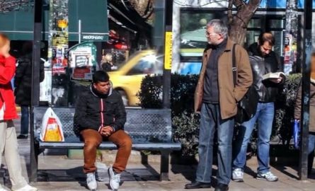 Στο περιστατικό ο ηθοποιός από το Μπαγκλαντές κάθεται στο παγκάκι της στάσης και ο ηθοποιός από την Ελλάδα ενοχλείται και του επιτίθεται φραστικά. Περισσότερα από 200 άτομα παρακολούθησαν τη σκηνή, η οποία επαναλήφθηκε 22 φορές σε 8 ώρες μπροστά σε διαφορετικούς κάθε φορά παρευρισκομένους.