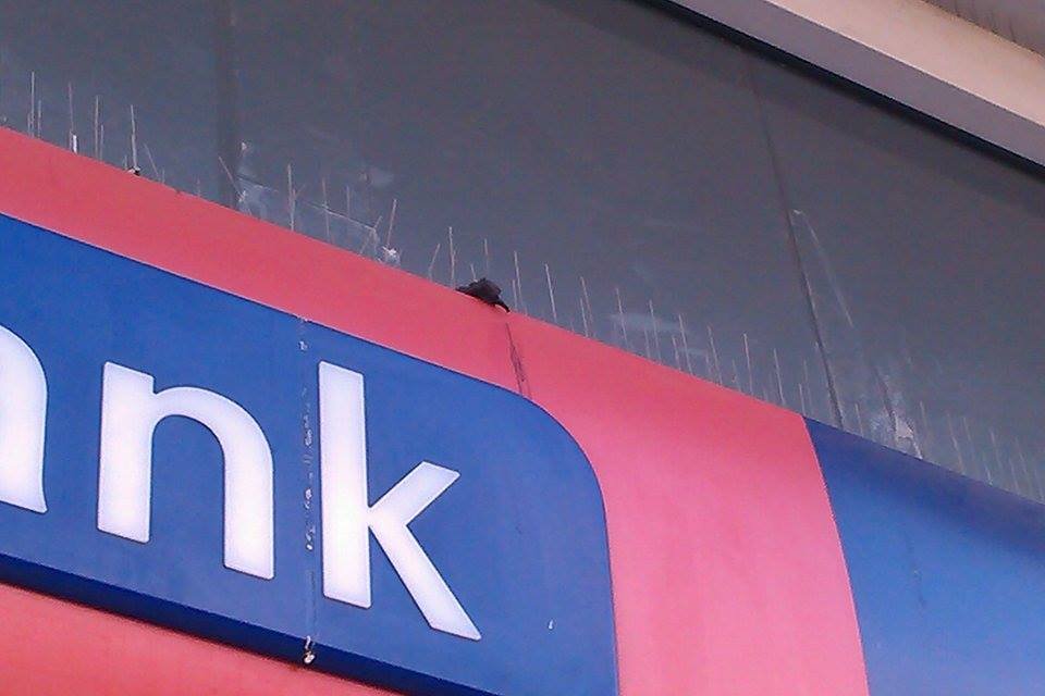 Τα συγκεκριμένα καρφιά που χρησιμοποιεί το υποκατάστημα της Eurobank στα Χανιά πρέπει να είναι παλαιού τύπου αφού δείχνουν προς τα πάνω και παρουσιάζονται αιχμηρά.