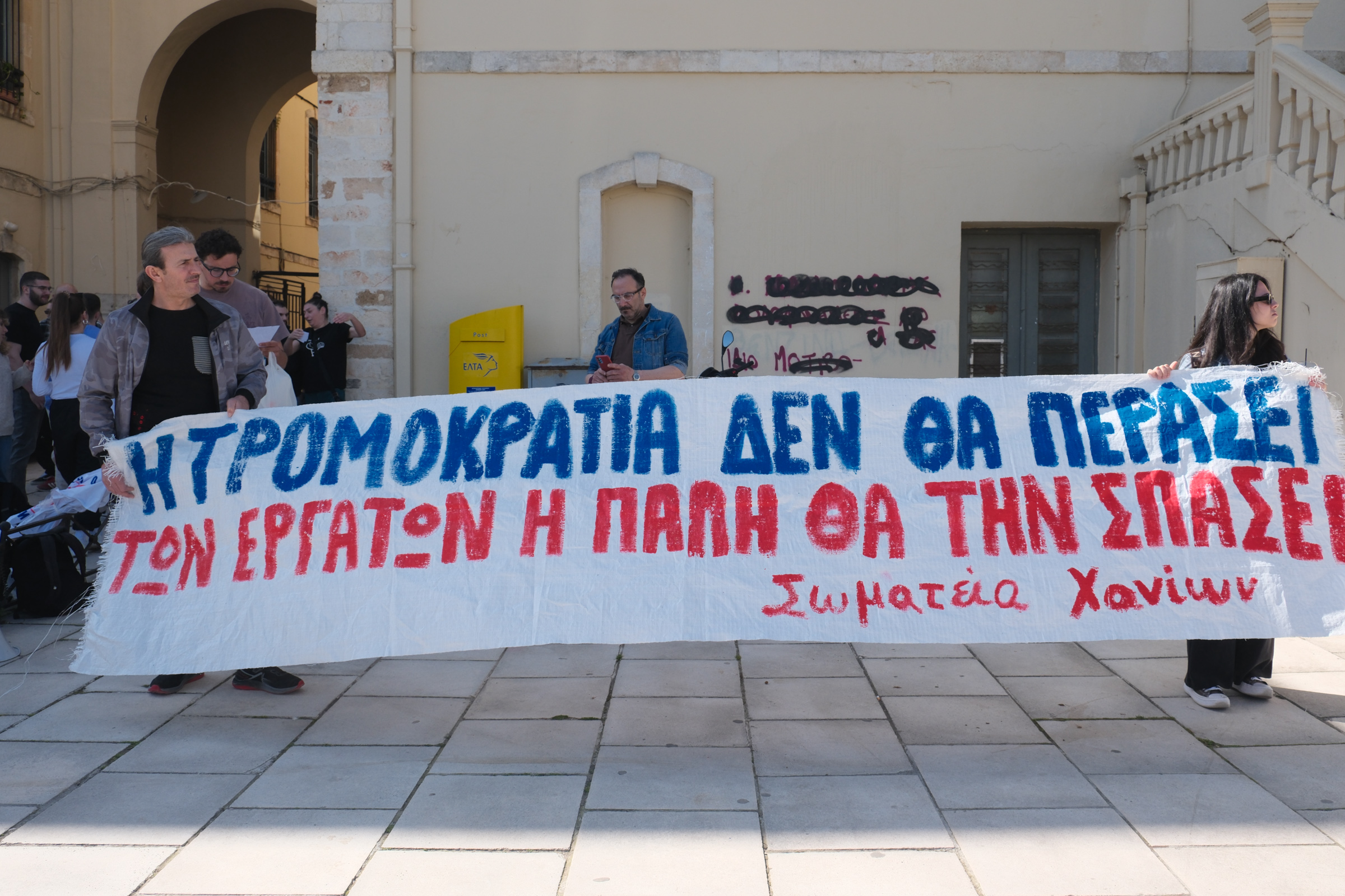 Το πρωί της Δευτέρας 7 Απριλίου πραγματοποιήθηκε συγκέντρωση διαμαρτυρίας έξω από τα Δικαστήρια Χανίων, με συμμετοχή συνδικαλιστικών φορέων.