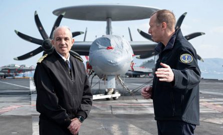 Το γαλλικό αεροπλανοφόρο «Σαρλ ντε Γκωλ» επισκέφθηκαν ο αρχηγός ΓΕΝ, αντιναύαρχος Ιωάννης Δρυμούσης, και ο αρχηγός Στόλου, αντιναύαρχος Δημήτριος-Ελευθέριος Κατάρας, στο πλαίσιο της συμμετοχής του Πολεμικού Ναυτικού στην επιχείρηση «ΑΝΤΑRES», με την ευκαιρία του κατάπλου του αεροπλανοφόρου στο Ναύσταθμο Κρήτης, την Παρασκευή 17 Φεβρουαρίου.