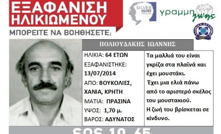 Ο Γιάννης Πολιουδάκης 64 χρόνων μαραγκός και αγρότης, εξαφανίστηκε στις αρχές Ιουλίου κάτω από αδιευκρίνιστες συνθήκες από το σπίτι όπου έμενε μόνος του, στο χωριό Βουκολιές.