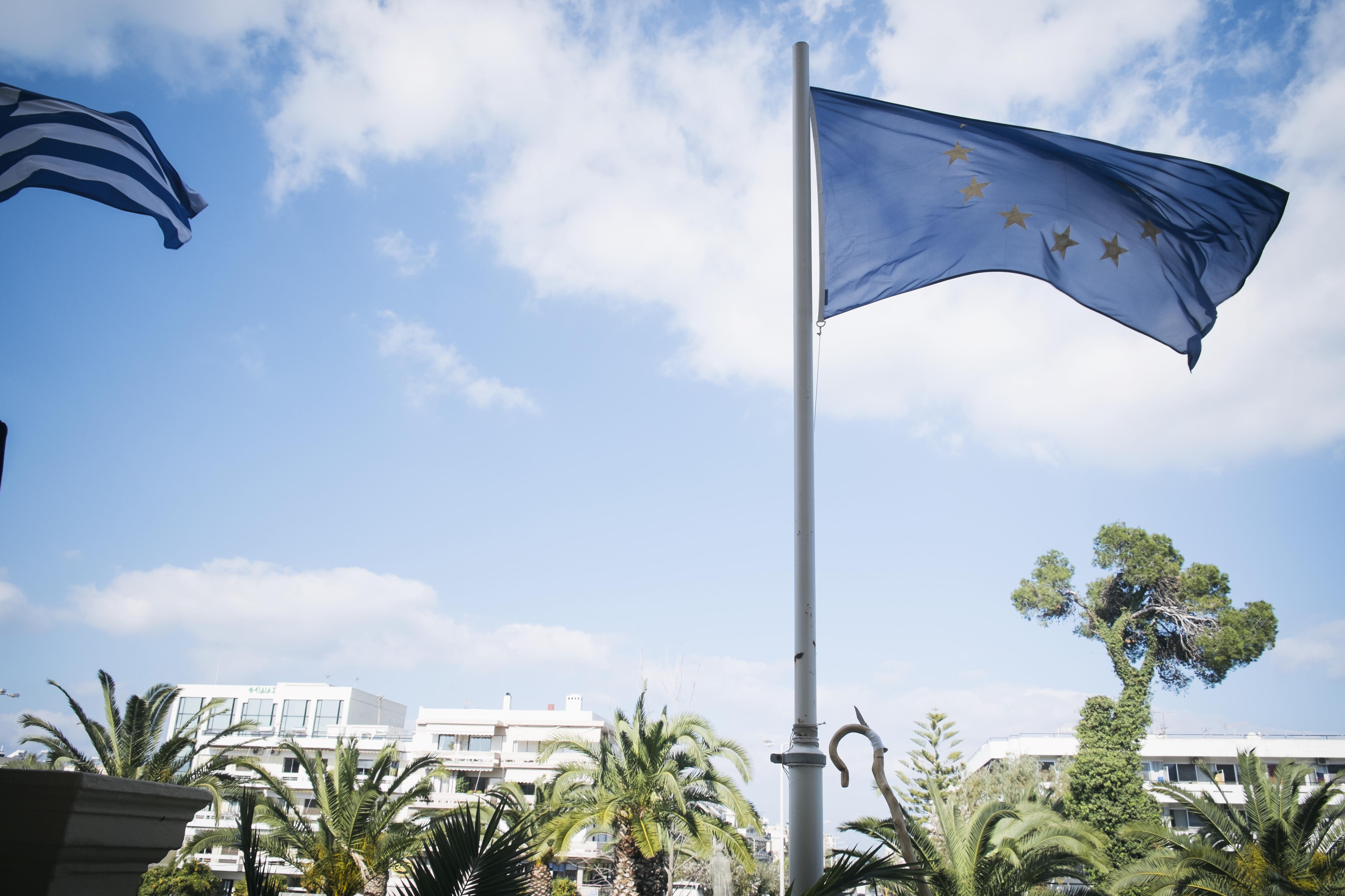 Αγρότης κατεβάζει την σημαία της Ε.Ε. στην σημερινή αγροτική κινητοποίηση στα γραφεία της αντιπεριφέρειας Χανίων.