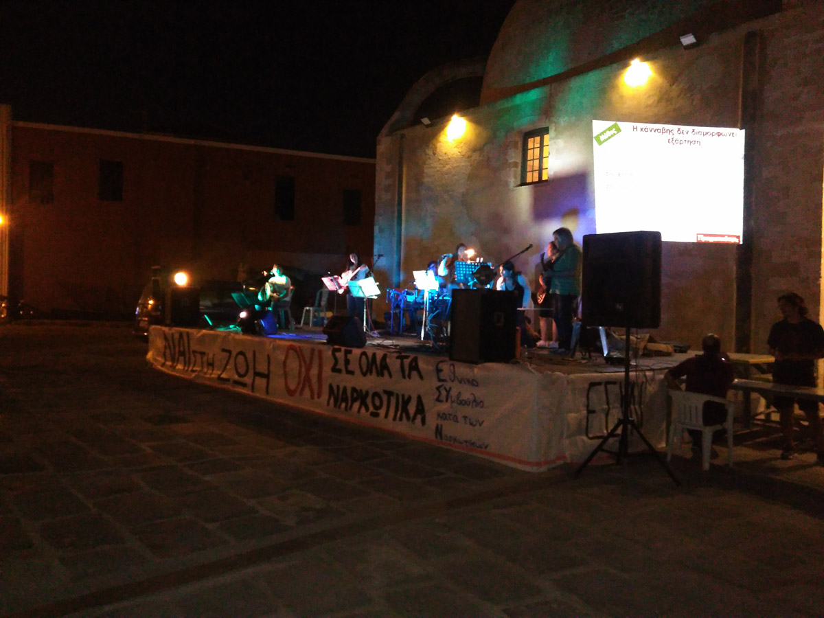Η πρώτη μέρα ολοκληρώθηκε με εκδήλωση στο Γιαλί Τζαμί. Στην εκδήλωση απεύθυνε χαιρετισμό εκ μέρους του Παραρτήματος Χανίων ο Γιώργος Τσαουσάκος. Σημείωσε ότι «η κυβέρνηση στρώνει το έδαφος για τη νομιμοποίηση της κάνναβης με πρόσχημα ευεργετικές και χρηστικές ιδιότητές της. Με το νόμο που ψήφισε πρόσφατα, στοχεύει κατευθείαν στο μυαλό και την καρδιά των νέων ανθρώπων. Όμως δεν μπορούν να μιλούν για το καλό της υγείας μας αυτοί που μας πετάν έξω από τα νοσοκομεία.