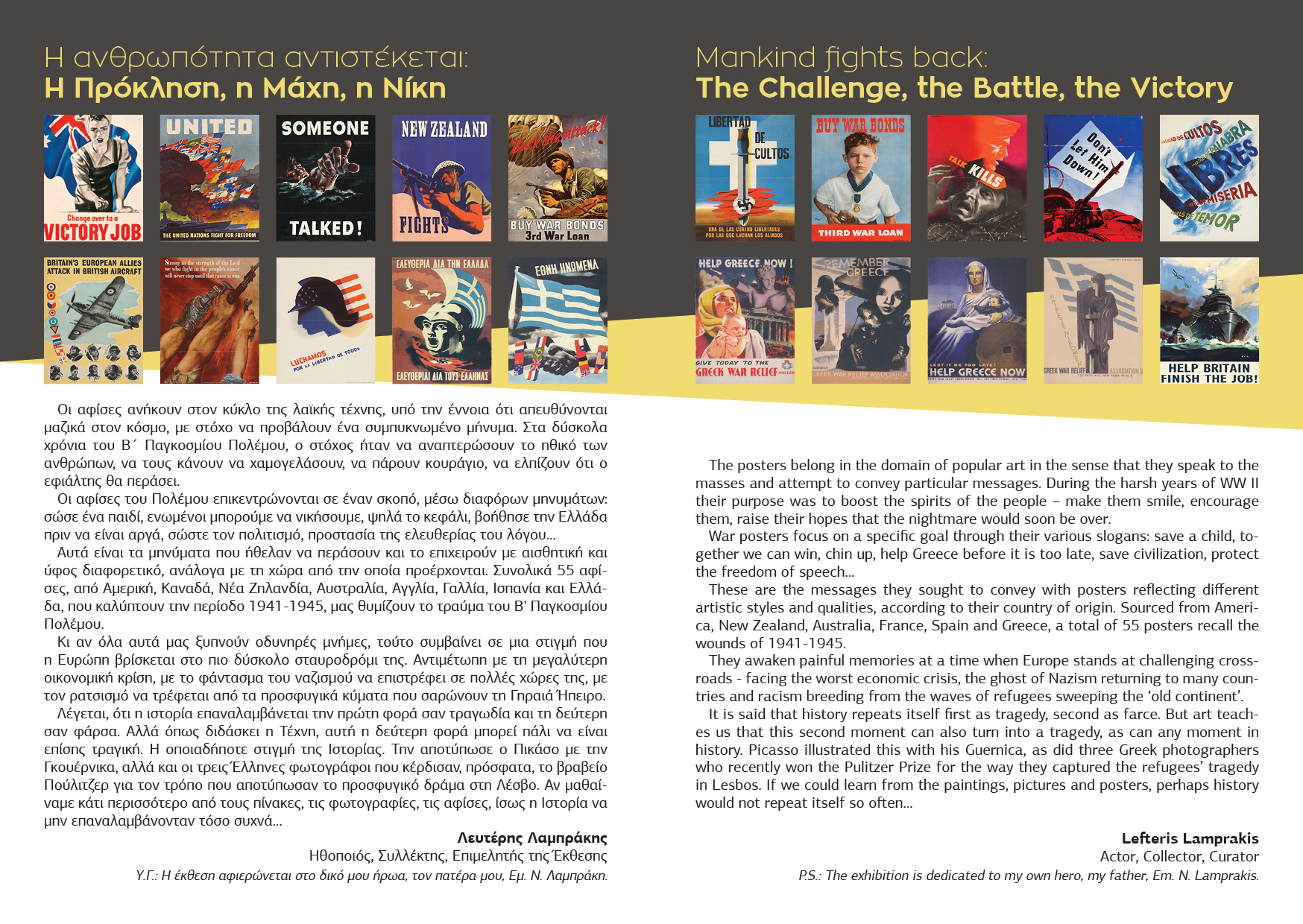 Η Έκθεση με τίτλο: «Η Ανθρωπότητα Αντιστέκεται: Η Πρόκληση, η Μάχη, η Νίκη» έχει ως επιμελητή τον κ. Λευτέρη Λαμπράκη, διοργανώνεται στο Πολιτιστικό Κέντρο Καντάνου, και ανοίγει τις πύλες της την Κυριακή 29 Μαΐου 2016, στις 12:00 η ώρα.
