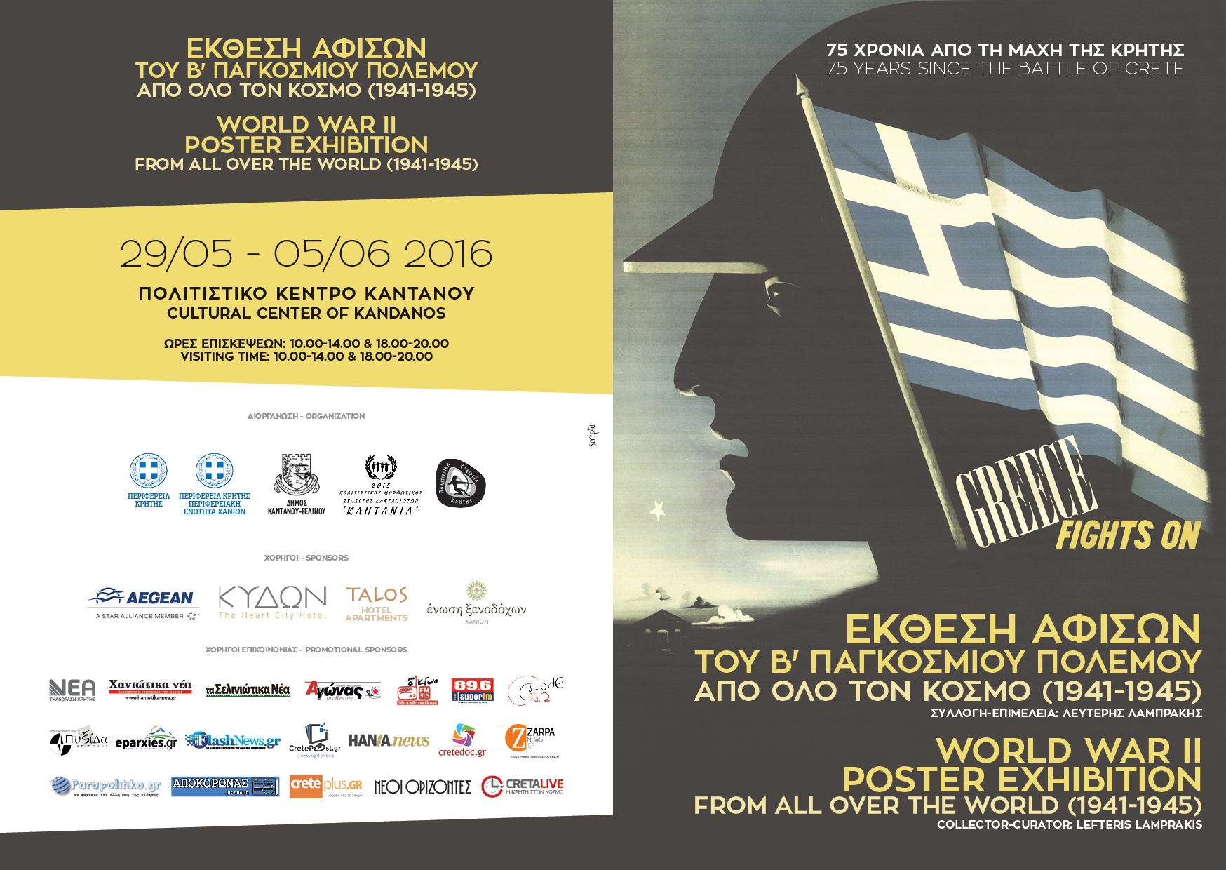 Η Περιφέρεια Κρήτης – Περιφερειακή Ενότητα Χανίων, ο Δήμος Καντάνου – Σελίνου, ο Πολιτιστικός & Μορφωτικός Σύλλογος Καντανιωτών “Καντάνια” και η Πολιτιστική Εταιρεία Κρήτης διοργανώνουν έκθεση με περιεχόμενο αφίσες του Β’ Παγκοσμίου Πολέμου από όλο τον κόσμο, από το αρχείο του Συλλέκτη και Ηθοποιού Λευτέρη Λαμπράκη, που προβάλλουν μηνύματα αισιοδοξίας και νίκης για τις συμμαχικές δυνάμεις, αλλά και αφίσες των γερμανών, καθώς και ταινίες με προπαγανδιστικό περιεχόμενο και των δύο αντιμαχόμενων στρατοπέδων.