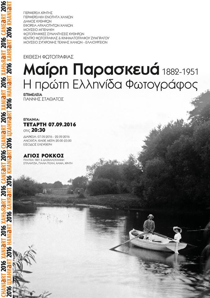 Εγκαίνια την Τετάρτη 7.9.2016 στις 20:30 της έκθεσης φωτογραφίας “ΜΑΙΡΗ ΠΑΡΑΣΚΕΥΑ (1882-1951) – Η Πρώτη Ελληνίδα Φωτογράφος” στον Άγιο Ρόκκο, Πλατεία 1821 & Δασκαλογιάννη, Σπλάντζια, Παλιά Πόλη, Χανιά, Κρήτη.