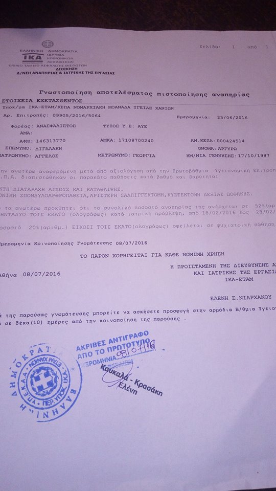 Χθές τρίτη 7 Φλεβάρη του 2017 και ώρα 7:30 μ.μ επισκέφτηκα την κ.Αργυρώ Διγαλάκη 30 ετών ύστερα απο δική της #έκκληση #βοήθειας στην ομάδα “Βοήθα με να μπορώ”. Η κ.Αργυρώ είναι #χωρισμένη #μητέρα δυο #ανηλικων #παιδιών ηλικίας 8 & 7 ετών .Η ίδια πάσχει απο χρόνια αυτοάνοσα νοσήματα (είναι ασθενής του ανοσοποιητικού, υποφέρει από αγκυλοποιητικη σπονδιλοαθρητιδα, ινομυαλγιες, χρόνιο πόνο και κυσταδενωματα σαλπιγκων κτλ.,) μη μεταδοτικά, δεν παίρνει καμιά διατροφή απο τον πρώην σύζυγο της για τα παιδιά ούτε κάποια σύνταξη αναπηρίας ενώ έκανε τα χαρτιά της στα κεπα η επιτροπή την έκοψε με 52% αναπηρία …Η κ.Αργυρώ ζητάει μια #εργασία για εκείνη αλλά και τον σύντροφό της . Η ίδια λόγο της ασθενείας της δεν μπορεί να κάνει και πολλά όμως με κάποιο τρόπο πρέπει να θρέψει τα παιδιά της τα οποία είναι οτι πολυτιμότερο έχει σε αυτήν την ζωή ..