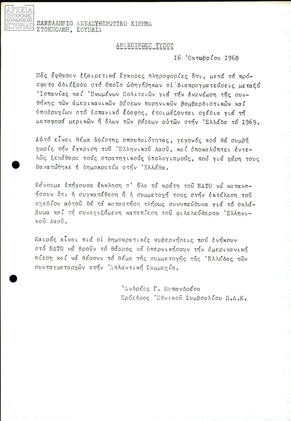 ΑΝΑΚΟΙΝΩΣΗ ΤΥΠΟΥ —————- 16 ‘Οκτωβρίου 1968