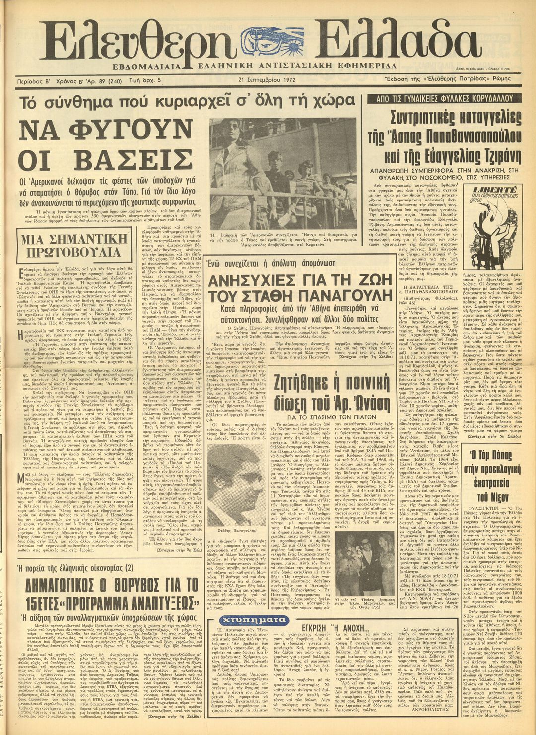 Προκηρύξεις καί τρύκ κυκλοφοροῦν καθημερινά στήν Ἀθήνα καί στά προάστια μέ τά ὁποῖα καταγγέλλεται ἡ ἐγκατάσταση τῶν ἀμερικανικῶν βάσεων, σάν θανάσιμος κίνδυνος γιά τήν ἀσφάλεια καί τήν εἰρήνη τῆς χώρας. Τό ΕΣ τοῦ ΠΑΜ μέ ἀνακοίνωσή του σύντομη περίληψη τῆς ὁποίας μετέδωσαν οἱ ξένοι ἀνταποκριτές, καταγγέλλει τό στρατοκρατικό δικτατορικό καθεστώς ὅτι παραχώρησε στούς Ἀμερικανούς πολεμικές ναυτικές βάσεις στόν Πειραιᾶ, γιά νά ἐξασφαλίσει τήν ὑποστήριξη τοῦ Νίξον, χάρη στήν ὁποία μπορεῖ καί διατηρεῖται στήν ἐξουσία, παρά τήν λαϊκή θέληση. «Ἡ μόνιμη παρουσία πολεμικῶν βάσεων καί ναυτῶν στήν περιοχή τοῦ Πειραιῶς — τονίζει ἡ ἀνακοίνωση τοῦ ΠΑΜ — θίγει τήν ἀνεξαρτησία τῆς Ἑλλάδος καί ἀποτελεῖ κίνδυνο γιά τήν Ἑλλάδα καί ὅλη τήν περιοχή».