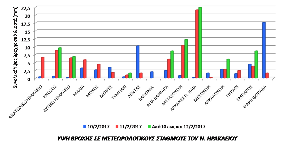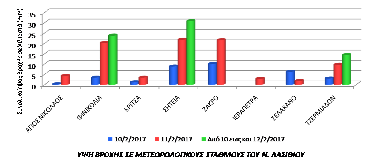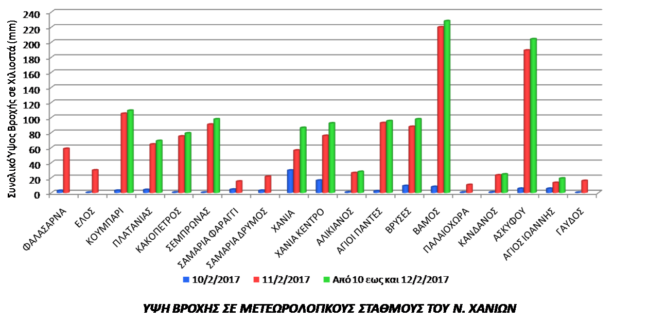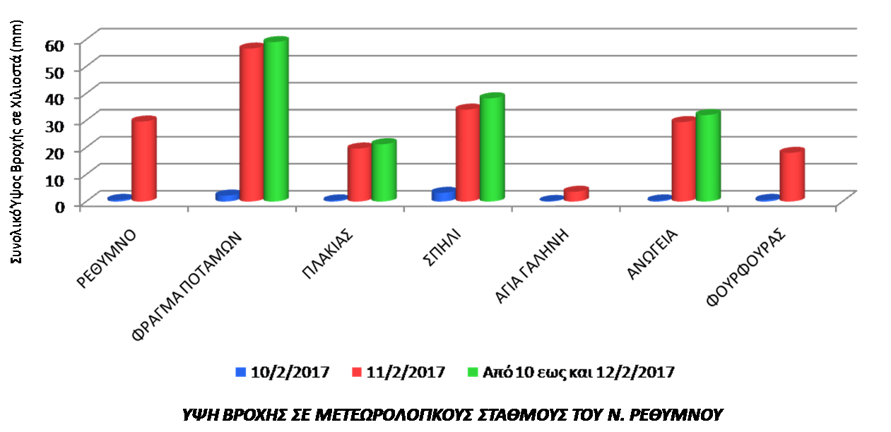 Στα διαγράμματα που ακολουθούν παρουσιάζονται τα ύψη βροχής , ανά Νομό της Κρήτης, ξεχωριστά για την Παρασκευή 10 και το Σάββατο 11 Φεβρουαρίου, ενώ στην 3η μπάρα εμφανίζεται το συνολικό ύψος βροχής από την Παρασκευή 10 έως και την Κυριακή 12 Φεβρουαρίου (σε σταθμούς όπου δεν εμφανίζεται η πράσινη μπάρα σημαίνει ότι δεν σημειώθηκε ίχνος βροχής την Κυριακή 12 Φεβρουαρίου). Από τα διαγράμματα αυτά είναι εμφανής η σημαντική διαφοροποίηση των υψών βροχής, μεταξύ της Ανατολικής και της Δυτικής Κρήτης, η οποία επλήγη πολύ εντονότερα από τη ζώνη σύγκλισης.