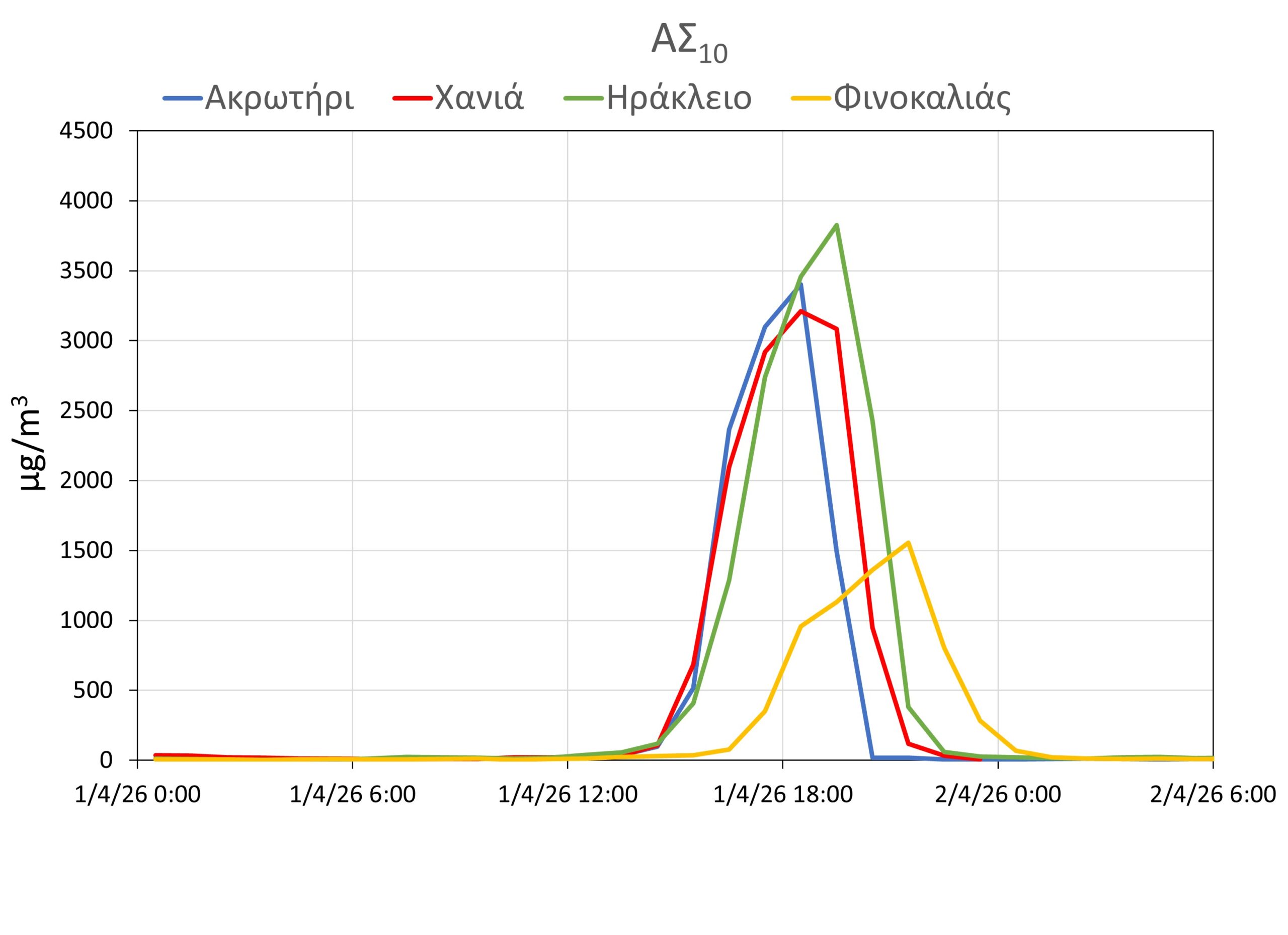 Ακραίο επεισόδιο μεταφοράς ερημικής σκόνης από τη Σαχάρα επηρέασε την Κρήτη την 1η Απριλίου 2026, με συγκεντρώσεις σωματιδίων που ξεπέρασαν κατά πολύ τα όρια της ανθρώπινης υγείας. Οι μετρήσεις του Δικτύου ΣΧΕΔΙΑ κατέγραψαν τιμές έως και 3.826 μg/m³ στο Ηράκλειο, δηλαδή 76 φορές πάνω από την οριακή ημερήσια τιμή των 50 μg/m³.