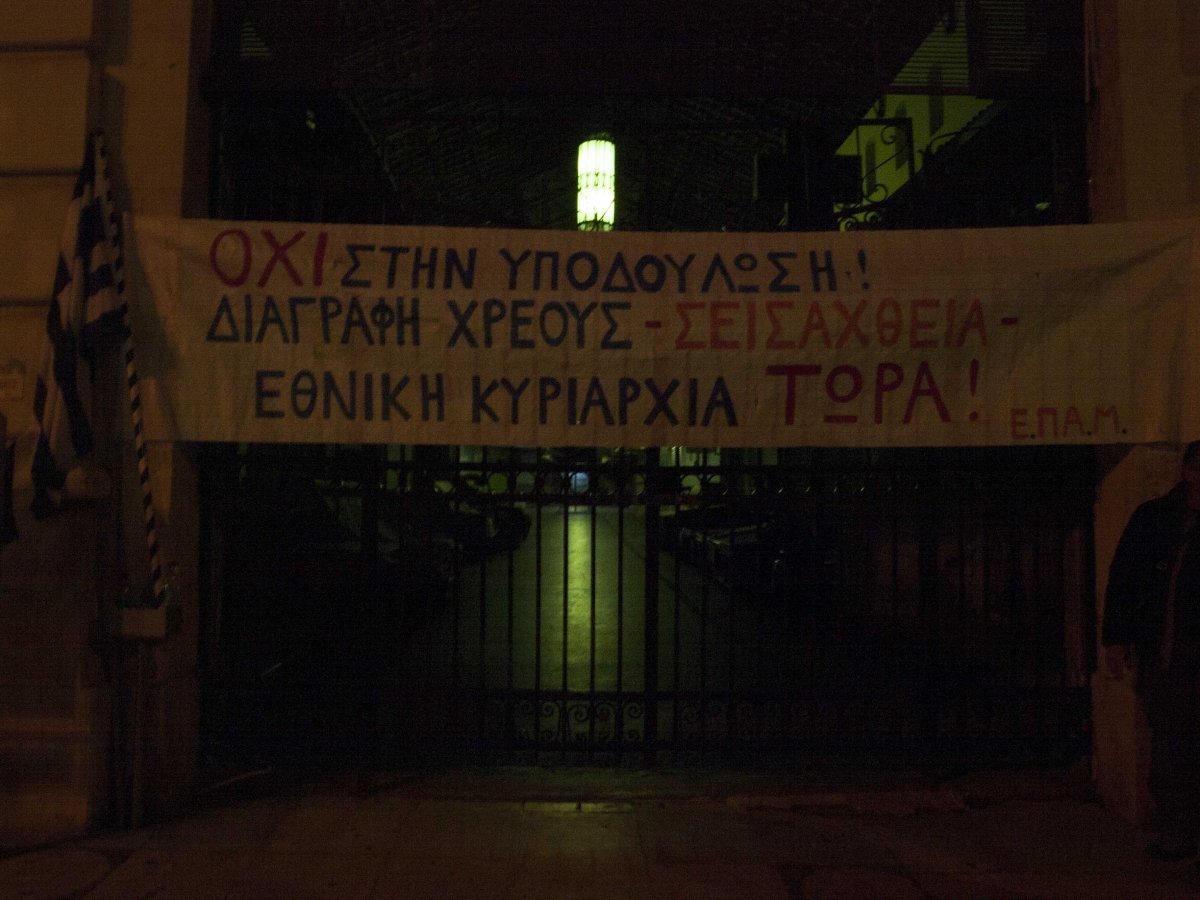 Αρκετά και τα πανό, από φοιτητές αλλά και από φορείς και πολιτικές οργανώσεις. Ένα έγραφε «Ελεύθεροι Πολιορκημένοι» ενώ ένα άλλο είχε το μήνυμα: «Όχι στην υποδούλωση – Διαγραφή χρέους – Σεισάχθεια – Εθνική κυριαρχία τώρα».