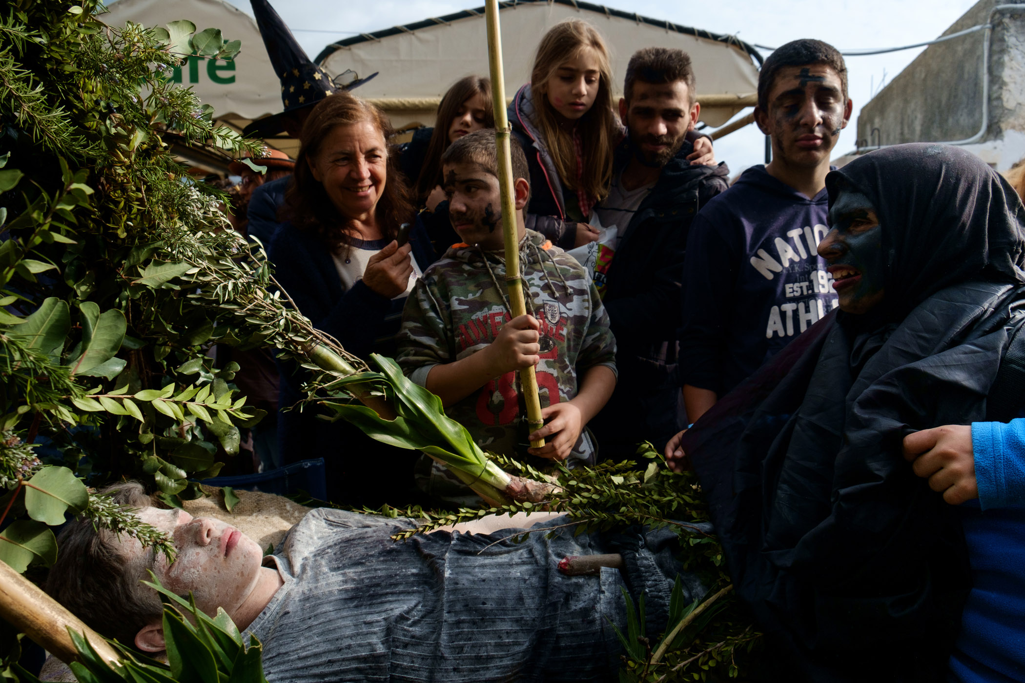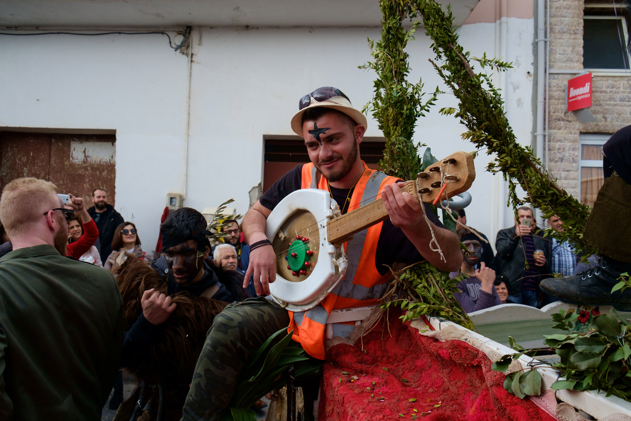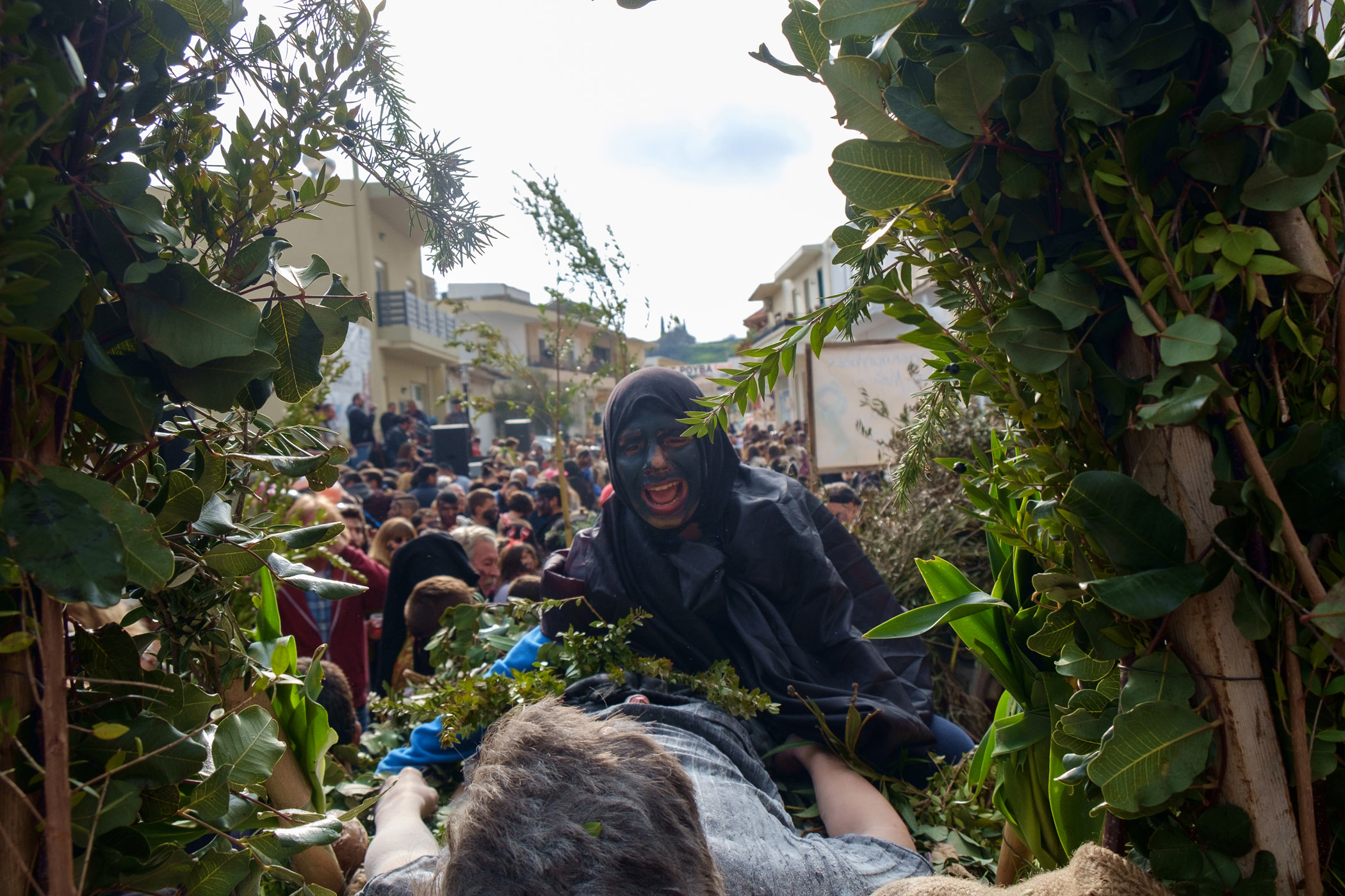 Αποτελεί μια παρωδία της εκφοράς του νεκρού, ο οποίος είναι ξαπλωμένος πάνω σε μια σκάλα ξύλινη συνήθως και σέβεται μέχρι τέλους το ρόλο του: δεν ανοίγει τα μάτια του, δε μιλάει ούτε γελάει παρά τα απίστευτα δίστιχα και μοιρολόγια που ακούει. Στόχος της πομπής είναι η ανάσταση του νεκρού κάνοντάς τον να γελάει και να θριαμβεύσει πάλι η χαρά και το γέλιο. Η πομπή αυτή τα έχει όλα: παπά, ψάλτη, χήρα που λέει εντυπωσιακά μοιρολόγια, συγγενείς που τον συνοδεύουν μέχρι τη στιγμή που θα συμβεί η ανατροπή και ο νεκρός μη μπορώντας να αντισταθεί στη μυρωδιά του κρασιού και των πειραγμάτων ανασταίνεται, γεγονός που συνοδεύεται από ξέφρενους χορούς όλου του θιάσου.