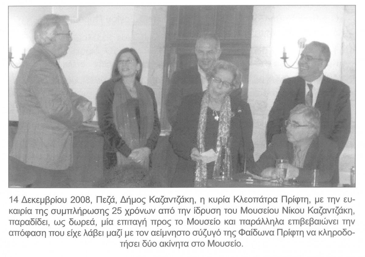 Το Μουσείο Νίκου Καζαντζάκη και η Διεθνής Εταιρεία Φίλων Νίκου Καζαντζάκη (ΔΕΦΝΚ) πληροφορήθηκαν με βαθιά τους θλίψη το θάνατο της Κλεοπάτρας Πρίφτη, στις 13 Αυγούστου 2015, ύστερα από μακρόχρονη ασθένεια. Σύμφωνα με την τελευταία της επιθυμία, αποτεφρώθηκε και η τέφρα της θα διασκορπιστεί στο Κρητικό Πέλαγος σε ευθετότερο χρόνο.