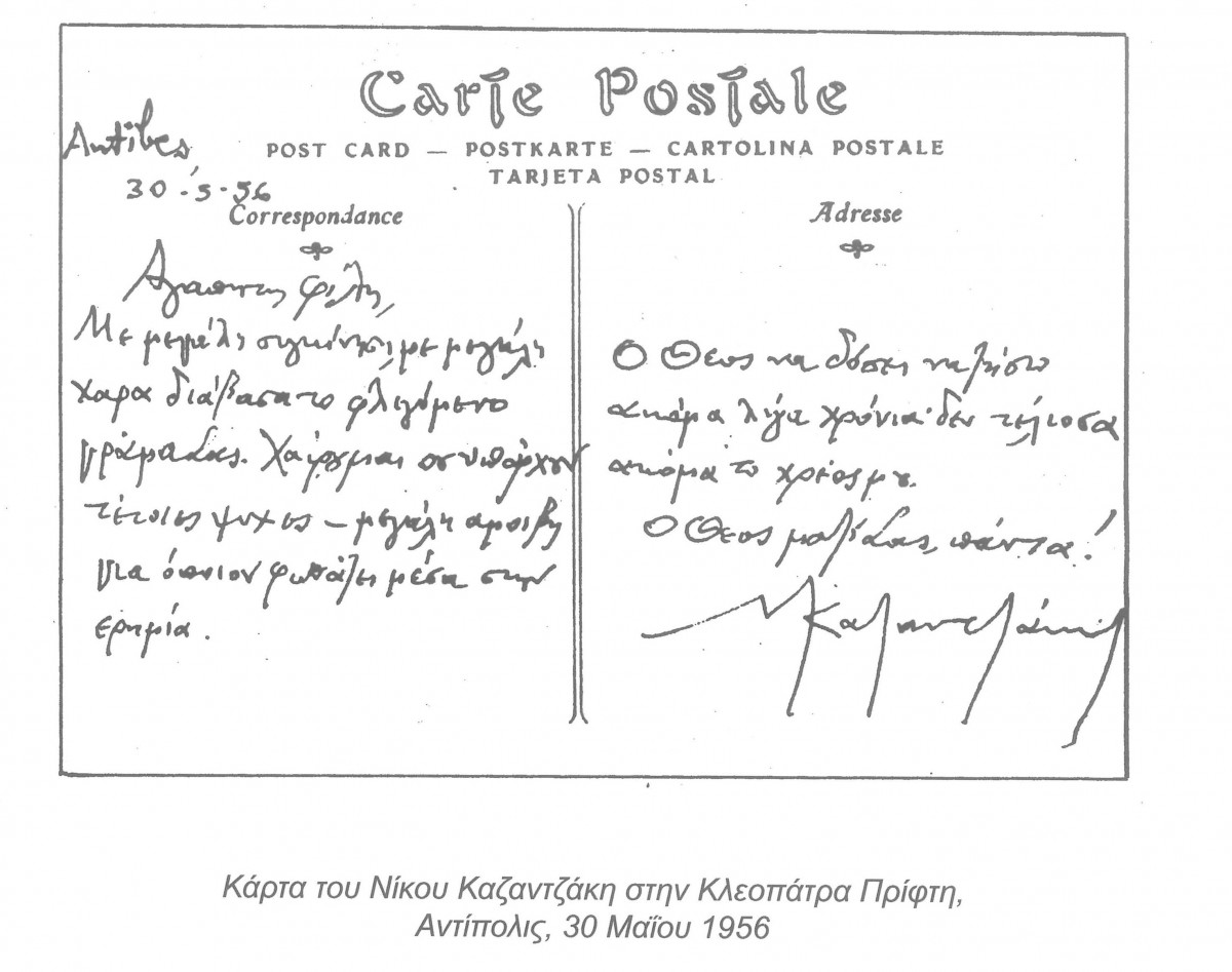 Στις 30 Μαΐου 1956, σε μια επιστολή του από την Αντίμπ, γράφει ο Καζαντζάκης (τον είχε γνωρίσει προσωπικά στην Αθήνα το 1945): «Με μεγάλη συγκίνηση, με μεγάλη χαρά διάβασα το θερμό γράμμα Σας. Χαίρουμαι που υπάρχουν τέτοιες ψυχές –μεγάλη αμοιβή για όποιον φωνάζει μέσα στην ερημία».