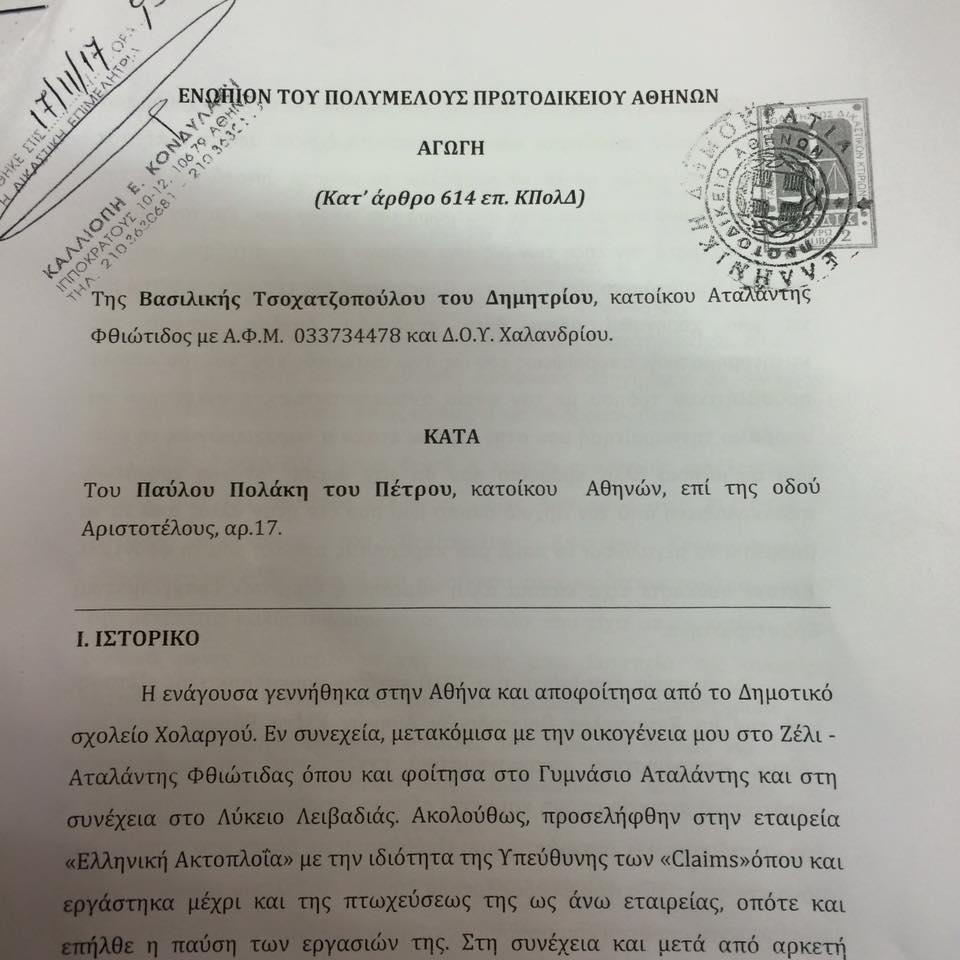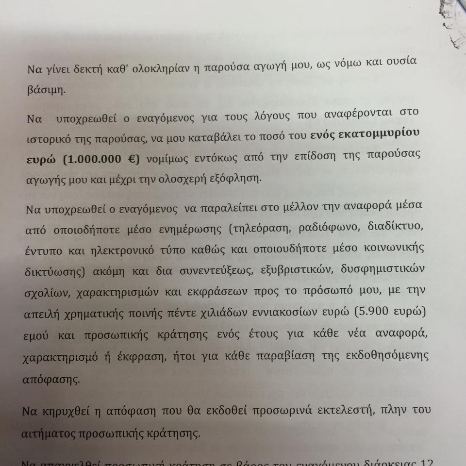 Χθες το πρωι δικαστικός επιμελητής παρέδωσε στο γραφείο μου στο Υπουργειο την Αγωγη που κατέθεσε ο Δικηγορος κος Αγαπηνος Εξ ονόματος της Βίκυς Σταματη και με την οποία μου ζητάει ΑΠΟΖΗΜΙΩΣΗ 1.000.000 ευρω για την ηθική βλαβη που της προξένησαν οι χαρακτηρισμοί “φτωχό νυμφιδιο ” και νεόπλουτο τσουλι” που της απεύθυνα μεςω κοινωνικών Δικτυων οταν ειδα τη φωτογραφια με το προτεταμένο μεςαιο δάκτυλο καθώς οδηγούνταν για δεύτερη φορα στη φυλακή!!!!!!!