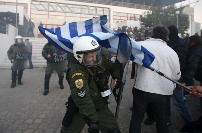 Περίπου μισή ώρα μετά τις τέσσερις το απόγευμα, ομάδες ατόμων, πολλά από τα οποία είχαν καλυμμένα τα χαρακτηριστικά του προσώπου τους, με μαντήλια, κουκούλες κλπ, έριξαν σε βάρος των αστυνομικών δυνάμεων κροτίδες και καπνογόνα.