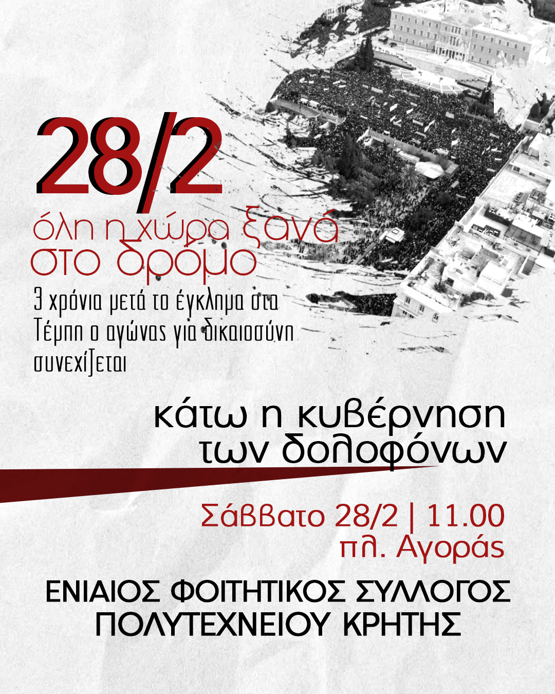 Απόφαση του Ενιαίου Φοιτητικού Συλλόγου Πολυτεχνείου Κρήτης: Τρία χρόνια μετά τα Τέμπη, ο αγώνας για δικαιοσύνη συνεχίζεται