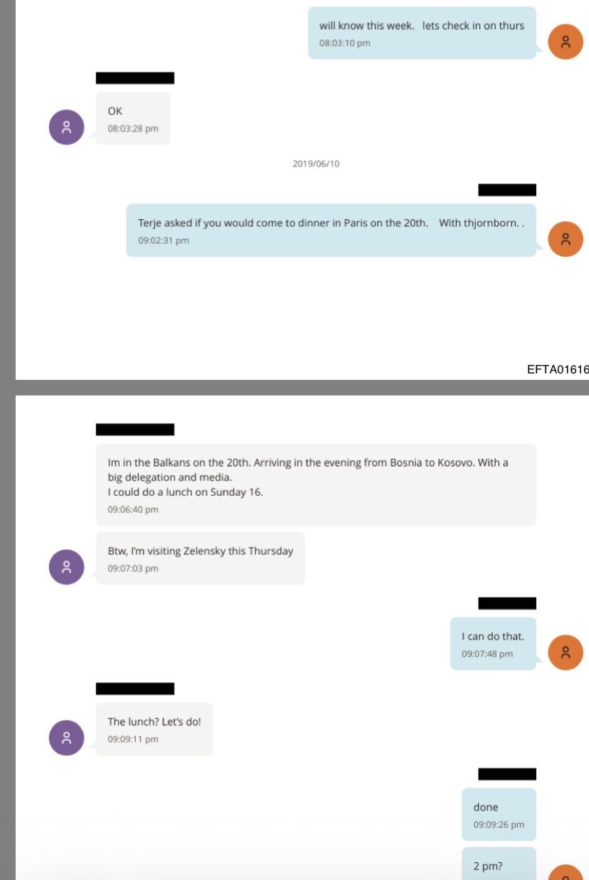 Επιπλέον στοιχεία από τα αρχεία καταγράφουν τον σχεδιασμό συναντήσεων που περιλαμβάνουν τον Ζελένσκι και διεθνείς παράγοντες. Σε συνομιλία με ημερομηνία 10 Ιουνίου 2019, γίνεται αναφορά σε πρόσκληση για δείπνο στο Παρίσι στις 20 του μηνός.